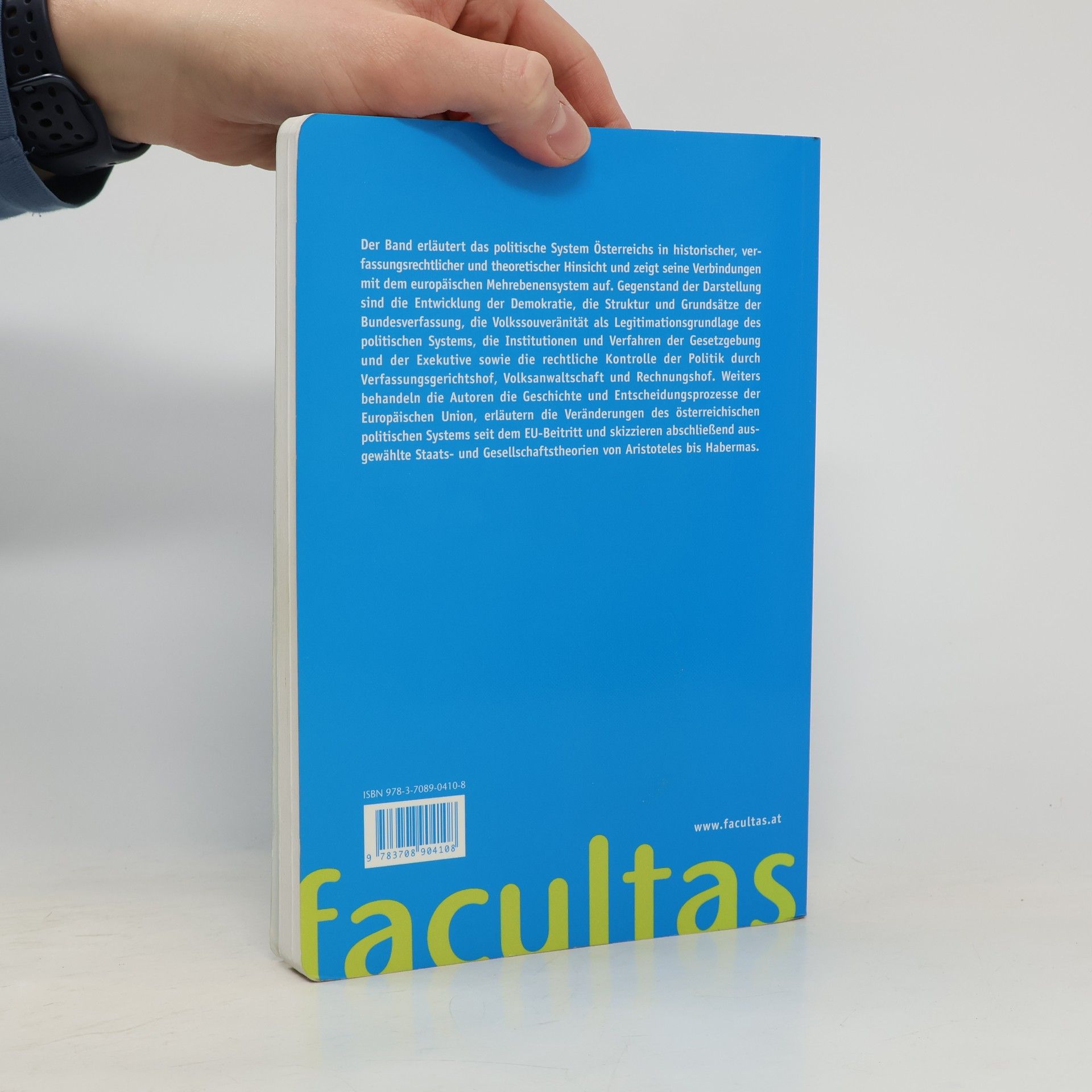 Der Band erläutert das politische System Österreichs in historischer, verfassungsrechtlicher und theoretischer Hinsicht und zeigt seine Verbindungen mit dem europäischen Mehrebenensystem auf. Gegenstand der Darstellung sind die Entwicklung der Demokratie, die Bundesverfassung, die Volkssouveränität als Legitimationsgrundlage des politischen Systems, die Institutionen und Verfahren von Gesetzgebung und Exekutive sowie die rechtliche Kontrolle der Politik durch Verfassungsgerichtshof, Volksanwaltschaft und Rechnungshof. Weiters behandeln die Autoren die Geschichte und Entscheidungsprozesse der EU und skizzieren ausgewählte Staats- und Gesellschaftstheorien von Aristoteles bis Habermas.