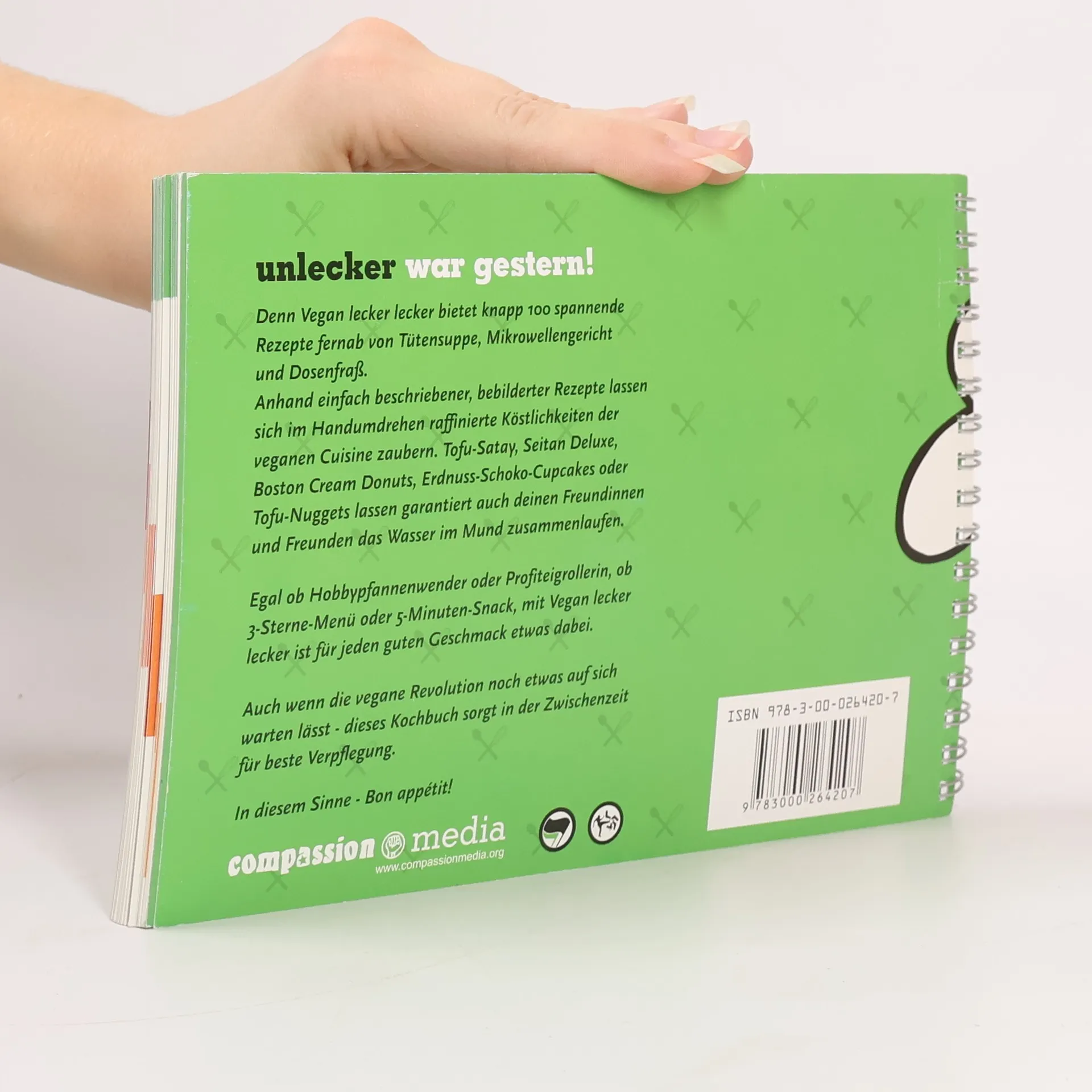 Unlecker war gestern! Denn “Vegan lecker lecker!” bietet knapp 100 spannende Rezepte fernab von Tütensuppe, Mikrowellengericht und Dosenfraß. Anhand einfach beschriebener, bebilderter Rezepte lassen sich im Handumdrehen raffinierte Köstlichkeiten der veganen Cuisine zaubern. Tofu-Satay, Seitan Deluxe, Boston Cream Donuts, Erdnuss-Schoko-Cupcakes oder Tofu-Nuggets lassen garantiert jedem das Wasser im Mund zusammenlaufen. Egal ob Hobbypfannenwender oder Profiteigrollerin, ob 3-Sterne-Menü oder 5-Minuten-Snack, mit “Vegan lecker lecker!” ist für jeden guten Geschmack etwas dabei.