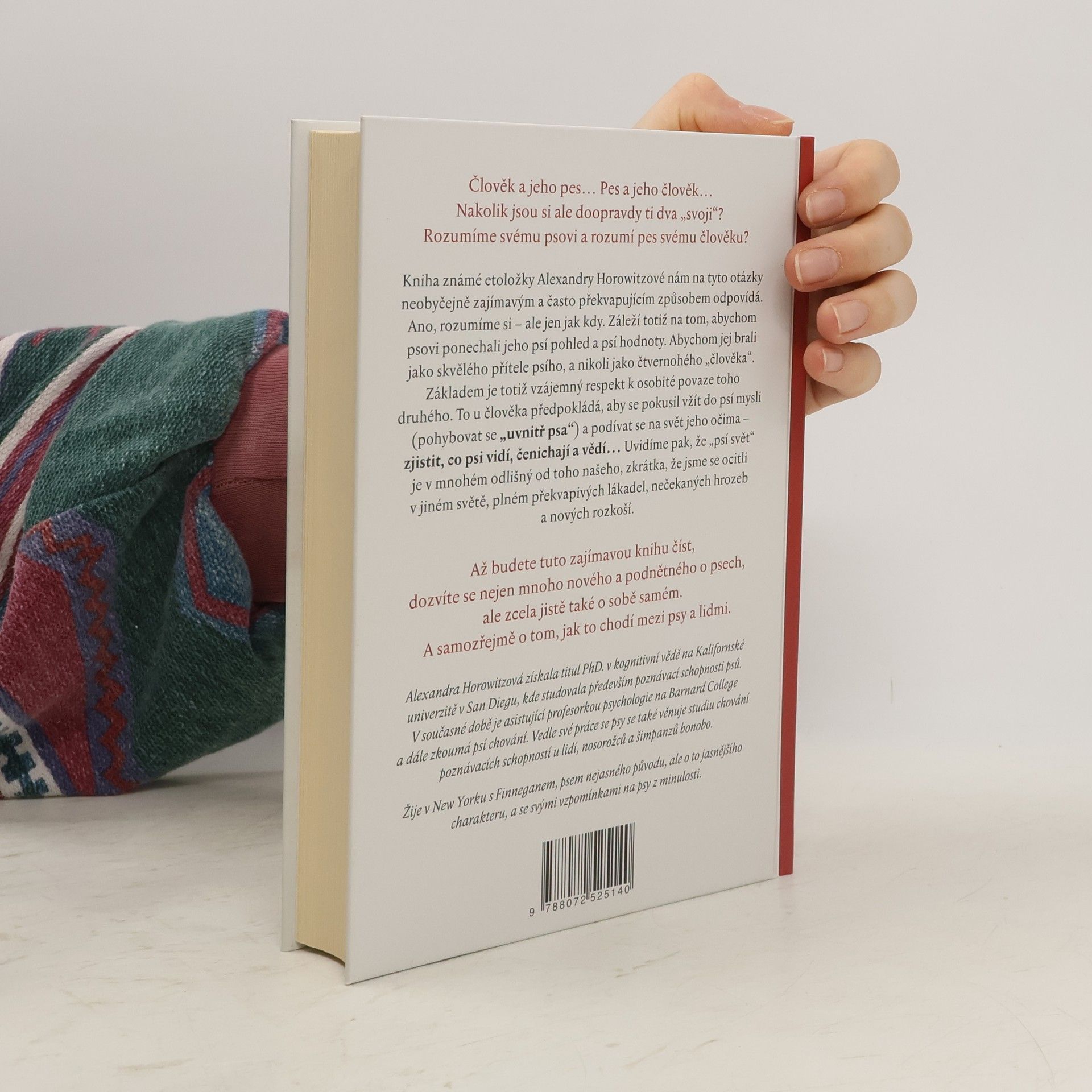 Člověk a jeho pes... Pes a jeho člověk... Nakolik jsou si ale doopravdy ti dva „svoji“. Rozumíme svému psovi a rozumí pes svému člověku? Kniha známé etoložky Alexandry Horowitzové nám na tyto otázky neobyčejně zajímavým a často překvapujícím způsobem odpovídá. Ano, rozumíme si – ale jen jak kdy. Záleží totiž na tom, abychom psovi ponechali jeho psí pohled a psí hodnoty. Abychom jej brali jako skvělého přítele psího a nikoli jako čtvernohého „člověka“. Základem je totiž vzájemný respekt k osobité povaze toho druhého. To u člověka předpokládá, aby se pokusil vžít do psí mysli (pohybovat se „uvnitř psa“) a podívat se na svět jeho očima – zjistit, co psi vidí, čenichají a vědí... Uvidíme pak, že „psí svět“ je v mnohém odlišný od toho našeho, zkrátka, že jsme se ocitli v jiném světě, plném překvapivých lákadel, nečekaných hrozeb a nových rozkoší. Až budete tuto zajímavou knihu číst, dozvíte se nejen mnoho nového a podnětného o psech, ale zcela jistě také o sobě samém. A samozřejmě o tom, jak to chodí mezi psy a lidmi.