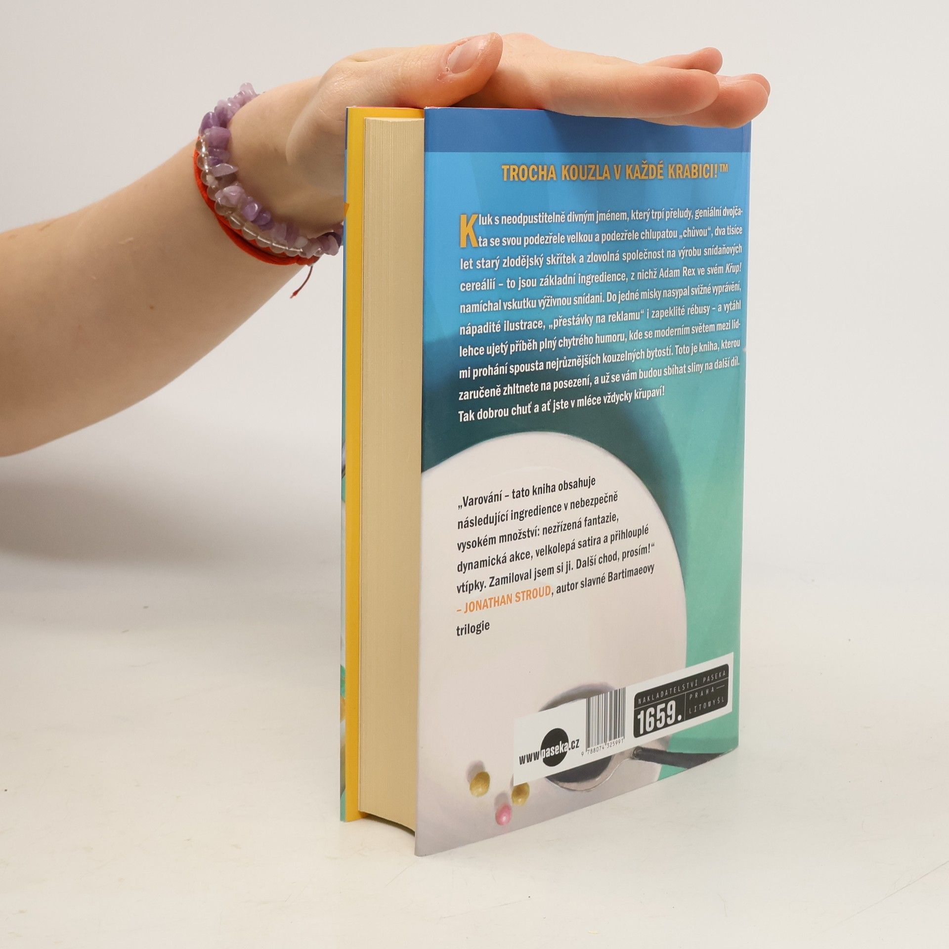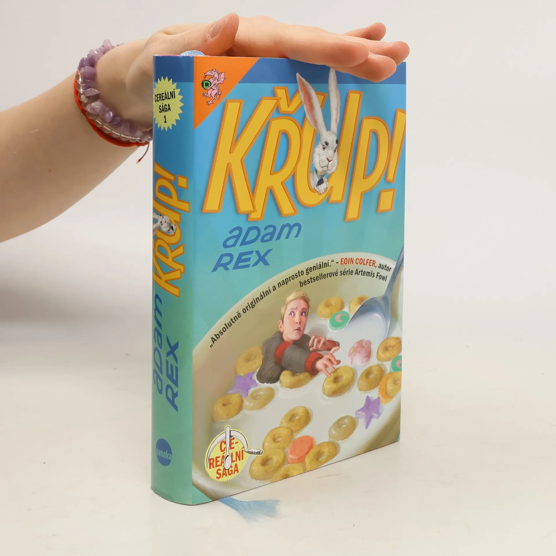 Kluk s neodpustitelně divným jménem, který trpí přeludy, geniální dvojčata se svou podezřele velkou a podezřele chlupatou "chůvou", dva tisíce let starý zlodějský skřítek a zlovolná společnost na výrobu snídaňových cereálií - to jsou základní ingredience, z nichž Adam Rex ve své sáze Křup! namíchal vskutku výživnou snídani. Do jedné misky nasypal svižné vyprávění, nápadité ilustrace, "přestávky na reklamu" i zapeklité rébusy - a vytáhl lehce ujetý příběh plný chytrého humoru, kde se moderním světem mezi lidmi prohání spousta nejrůznějších kouzelných bytostí. Toto je kniha, kterou zaručeně zhltnete na posezení, a už se vám budou sbíhat sliny na další díl. Tak dobrou chuť a ať jste v mléce vždycky křupaví!