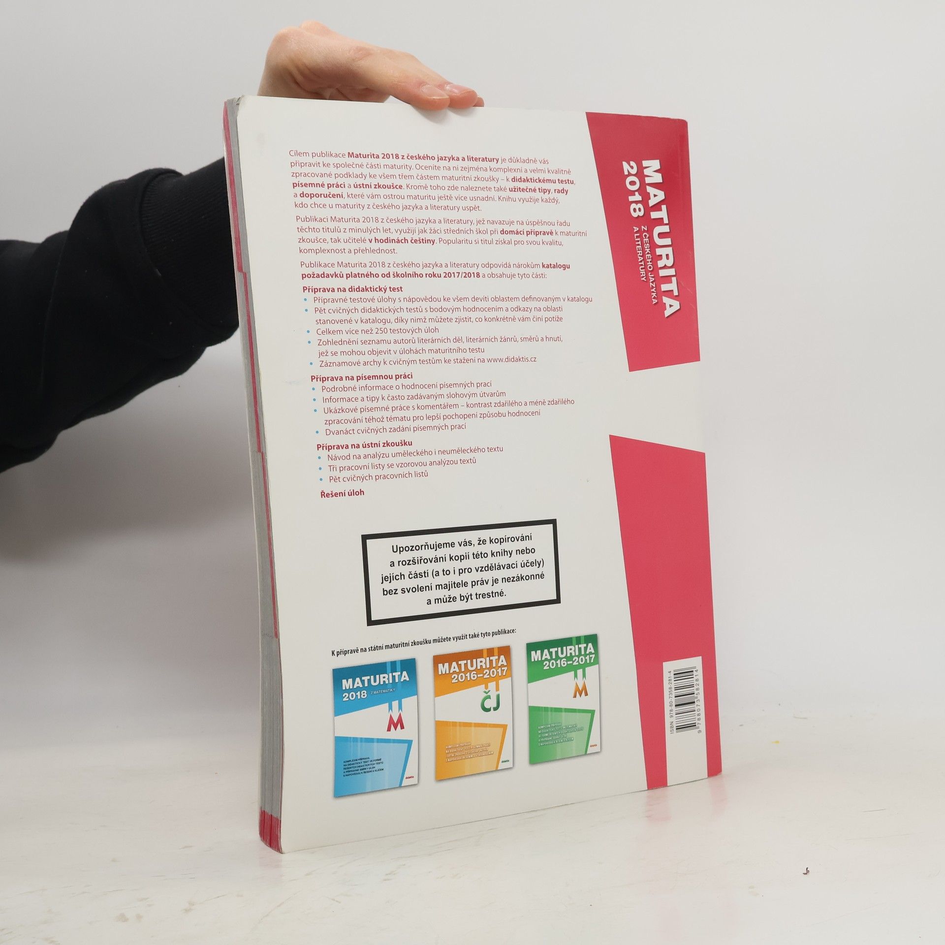 Cílem publikace Maturita 2018 z českého jazyka a literatury je důkladně připravit maturanty ke společné části maturity. Ocení na ní zejména komplexní a velmi kvalitně zpracované podklady ke všem třem částem maturitní zkoušky – k didaktickému testu, písemné práci a ústní zkoušce. Kromě toho zde naleznou také užitečné tipy, rady a doporučení, které jim ostrou maturitu ještě více usnadní. Knihu využije každý, kdo chce u maturity z českého jazyka a literatury uspět.