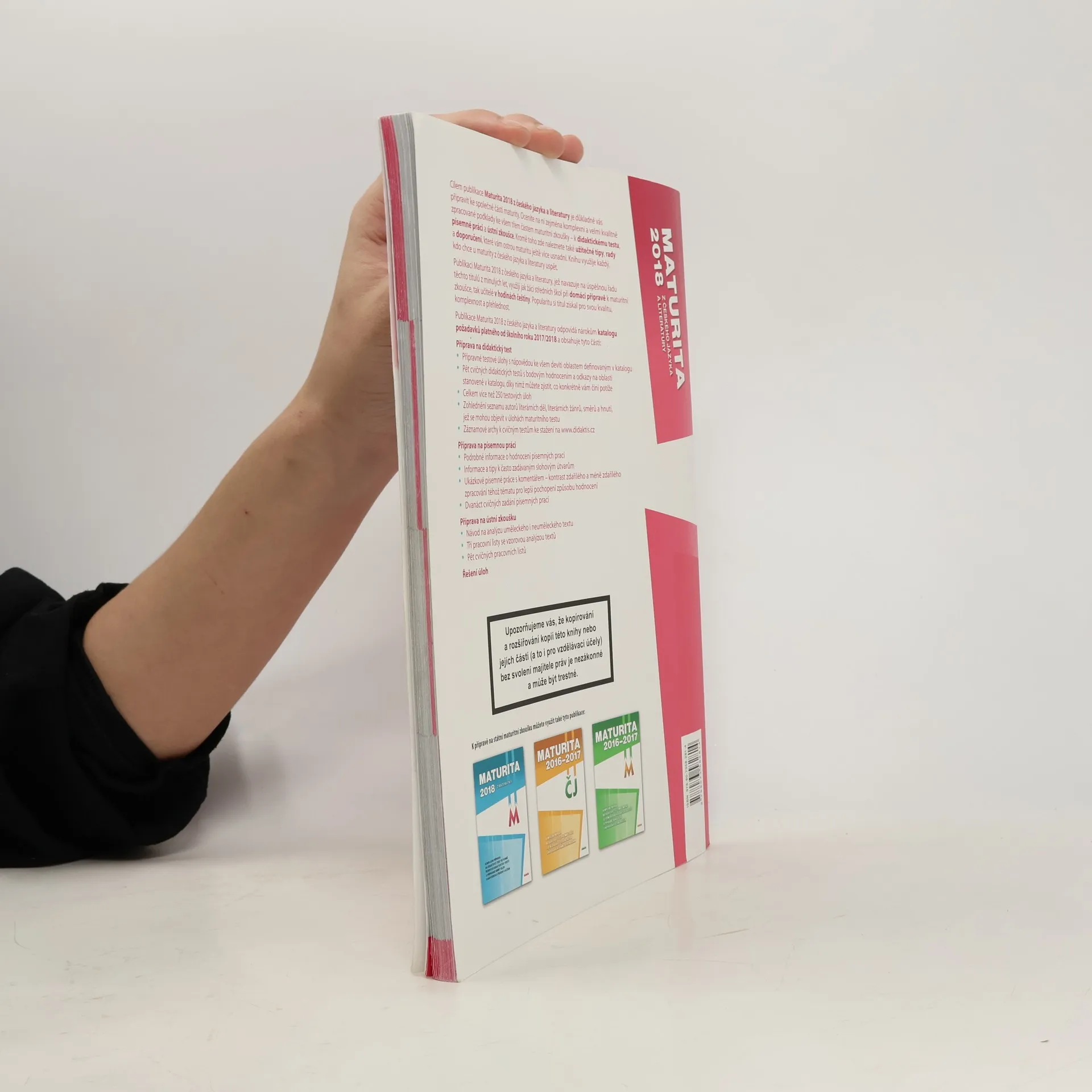 Cílem publikace Maturita 2018 z českého jazyka a literatury je důkladně připravit maturanty ke společné části maturity. Ocení na ní zejména komplexní a velmi kvalitně zpracované podklady ke všem třem částem maturitní zkoušky – k didaktickému testu, písemné práci a ústní zkoušce. Kromě toho zde naleznou také užitečné tipy, rady a doporučení, které jim ostrou maturitu ještě více usnadní. Knihu využije každý, kdo chce u maturity z českého jazyka a literatury uspět.