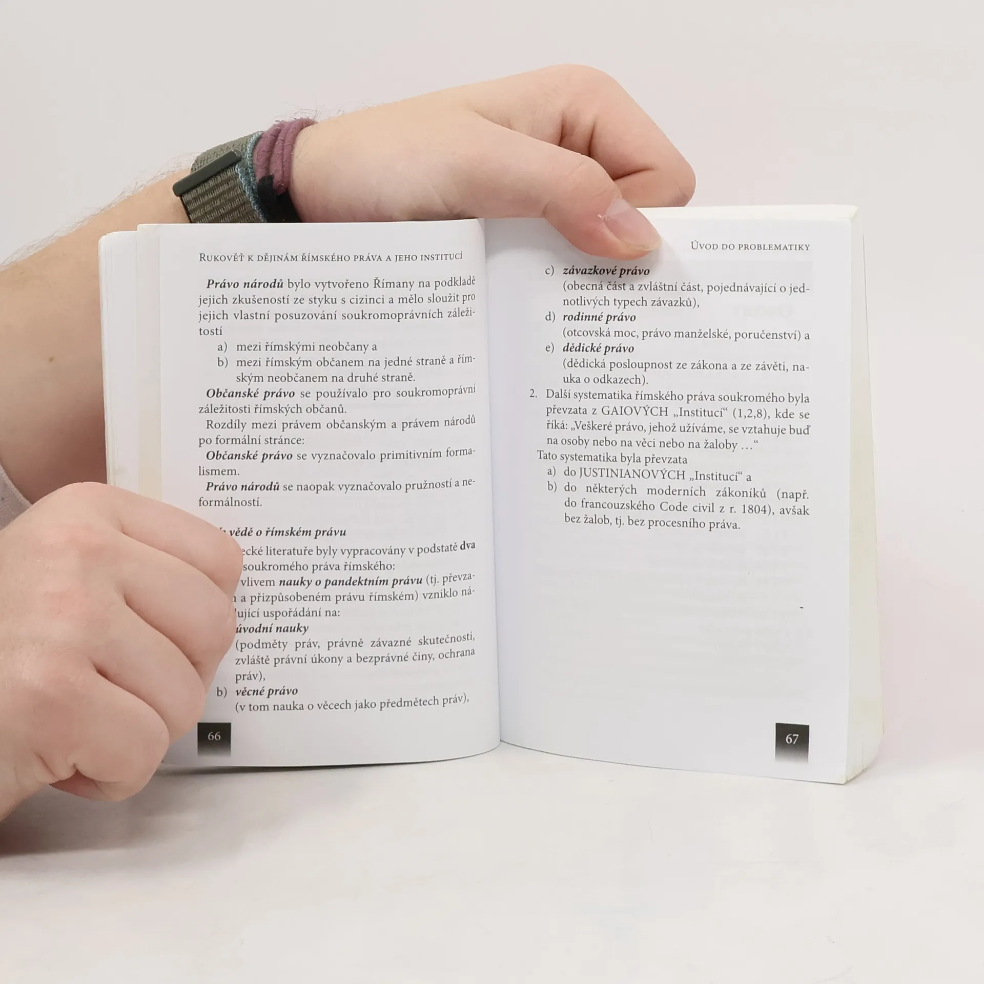 Publikace podává nástin systému soukromého práva římského a zároveň přibližuje jeho nejdůležitější instituty upravující práva osob, věcí a závazků, včetně práva dědického. Nabízí také exkurz zaměřený na římský civilní proces. Kromě výkladu o institutech římského práva přináší i obecnější výklad o římském státu a pramenech římského práva. Kniha je určena především studentům právnických fakult k přípravě ke státní souborné zkoušce. Pro informaci o základech římského práva a latinské terminologii však může posloužit i praktickým právníkům a širší čtenářské obci.