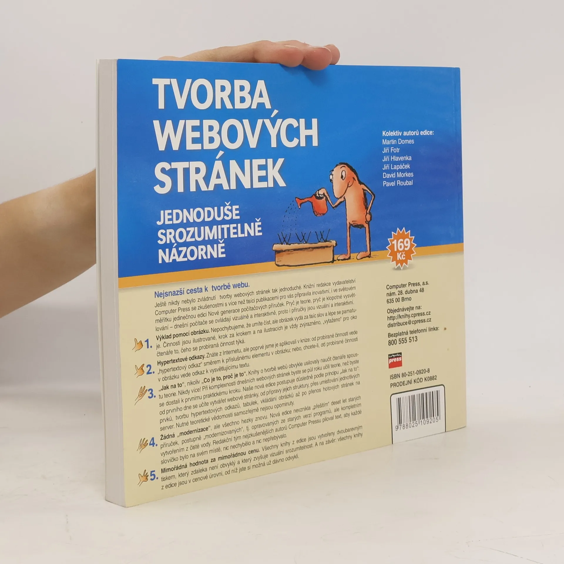 Nejsnazší cesta k tvorbě webu! Ještě nikdy nebylo zvládnutí tvorby webových stránek tak jednoduché. Výklad pomocí obrázku. Činnosti jsou ilustrované, krok za krokem a na ilustracích je vždy zvýrazněno, „vytaženo“ pro oko čtenáře to, čeho se probíraná činnost týká. Hypertextové odkazy. Znáte z Internetu, ale poprvé jsme je aplikovali v knize: od probírané činnosti vede „hypertextový odkaz“ směrem k příslušnému elementu v obrázku; nebo, chcete-li, od probírané činnosti v obrázku vede odkaz k vysvětlujícímu textu.. „Jak na to“, nikoliv „Co je to, proč je to“. Knihy o tvorbě webů obvykle usilovaly naučit čtenáře spoustu teorie. Od prvního dne se učíte vytvářet webové stránky, od přípravy jejich struktury, přes umisťování jednotlivých prvků, tvorbu hypertextových odkazů, tabulek, vkládání obrázků až po přenos hotových stránek na server. Nutné teoretické vědomosti samozřejmě nejsou opominuty.