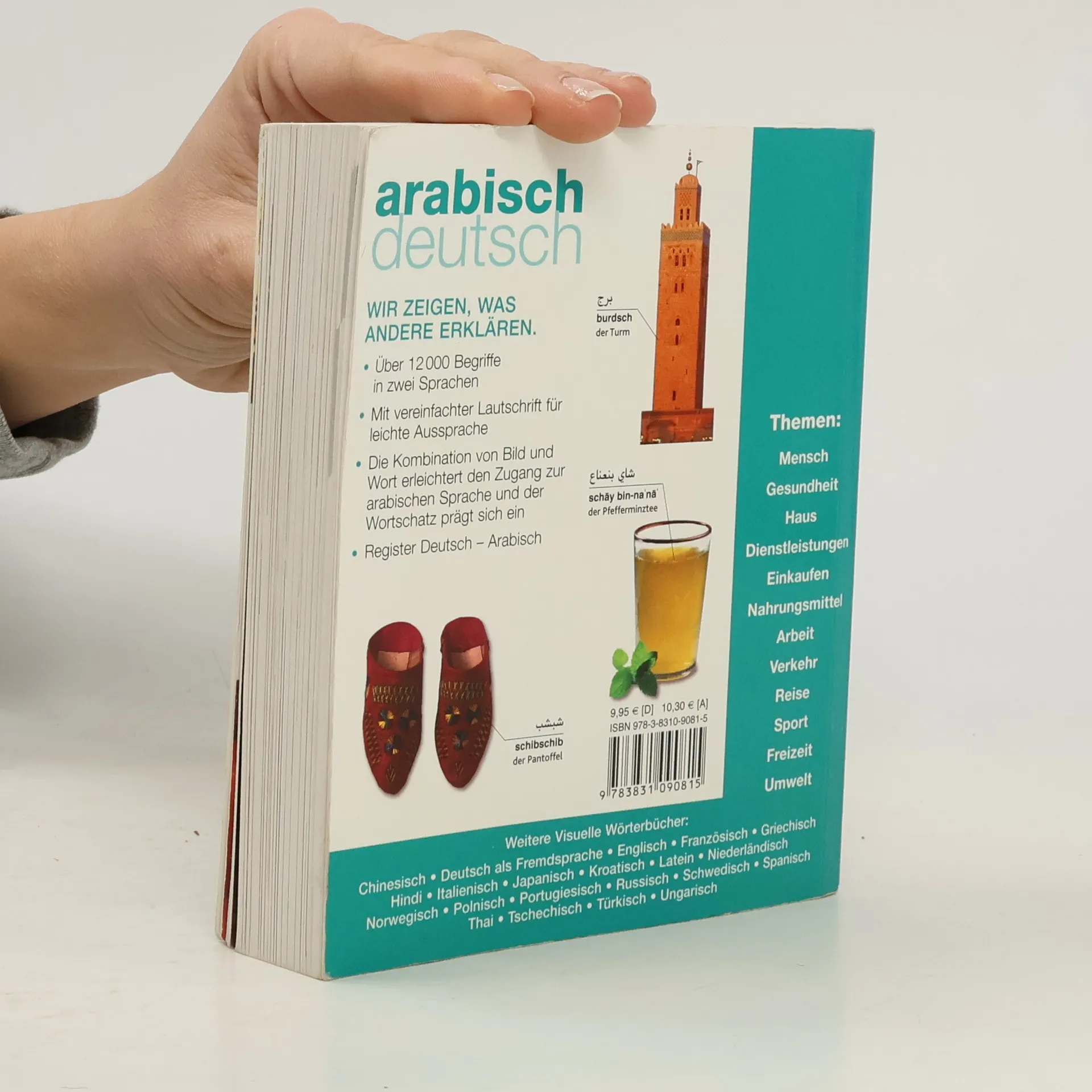 Dieses kompakte Bildwörterbuch stellt über 6000 arabische Begriffe und deren deutsche Übersetzung vor. Mehr als 1600 farbige Fotos und Grafiken sowie eine systematische Gliederung in verschiedene Bereiche des alltäglichen Lebens ermöglichen einen schnellen und lebendigen Zugang zur arabischen Sprache. Informationskästen mit grammatischen Erläuterungen runden das Buch ab. Ein anschaulicher, praktischer und kompetenter Begleiter für Reise, Beruf und zum Nachschlagen zu Hause. Mit Umschrift für leichte Aussprache.