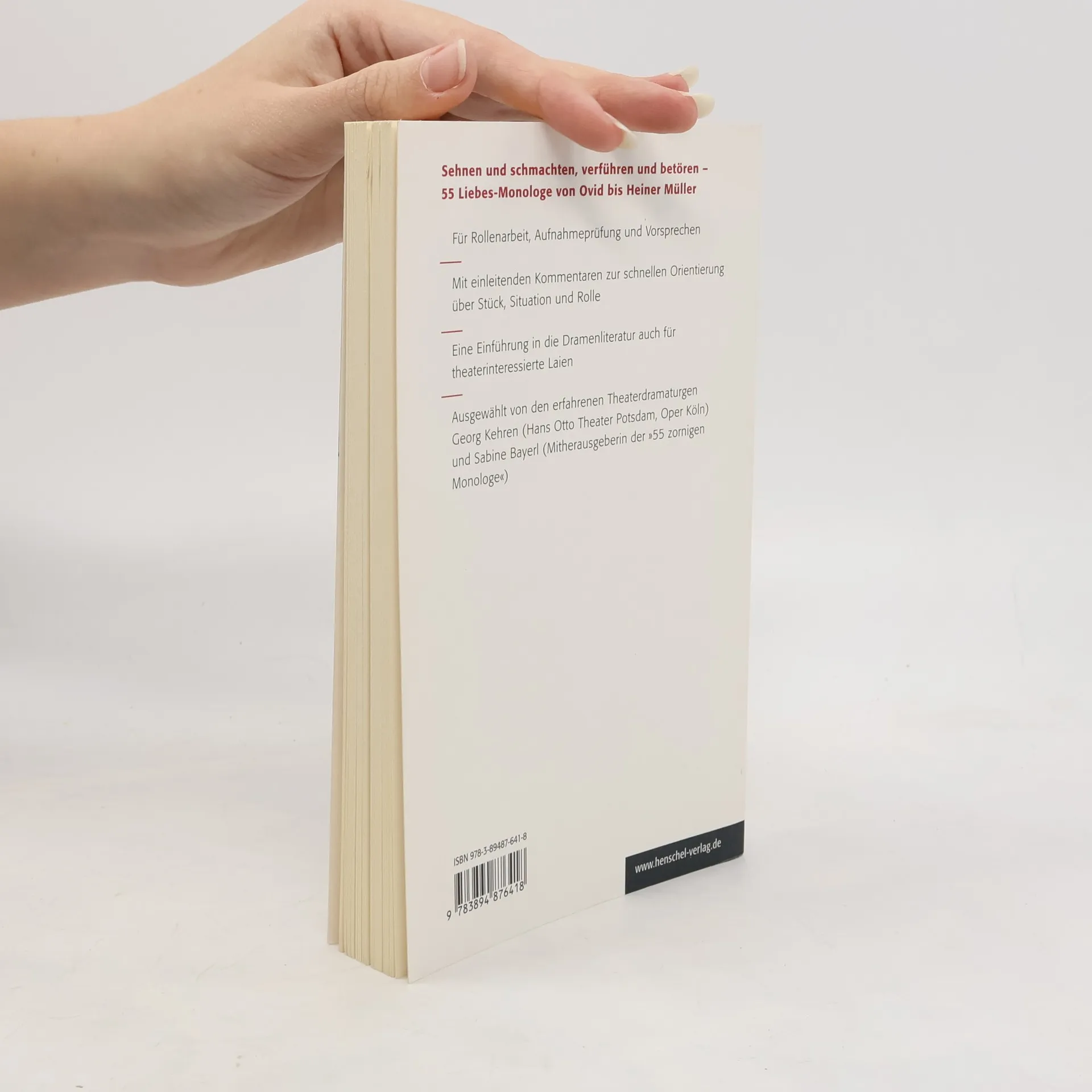 Die Liebe ist ein seltsames Spiel, sie kommt und geht, sie macht unfassbar glücklich oder zu Tode betrübt, sie versetzt Berge oder vernichtet, sie darf nicht sein oder wird nicht erwidert. „55 Monologe der Liebe, Lust und Leidenschaft“, der neueste Band der erfolgreichen Reihe, versammelt Monologe von Verliebten aus den wichtigsten Werken der Dramenliteratur, von der Antike bis zur Gegenwart, für Männer wie für Frauen. Einleitende Kommentare zu den Textauszügen bieten eine erste Orientierung zu Stück, Szene und Rolle. Ein umfangreiches Verzeichnis mit weiteren Rollenvorschlägen gibt zusätzliche Anregungen. Mit Texten von u. a.: Lope de Vega, Heinrich von Kleist, Lord Byron, Georg Büchner, Frank Wedekind, Max Frisch, Tennessee Williams, Heiner Müller, Sergi Belbel, Elfriede Jelinek.