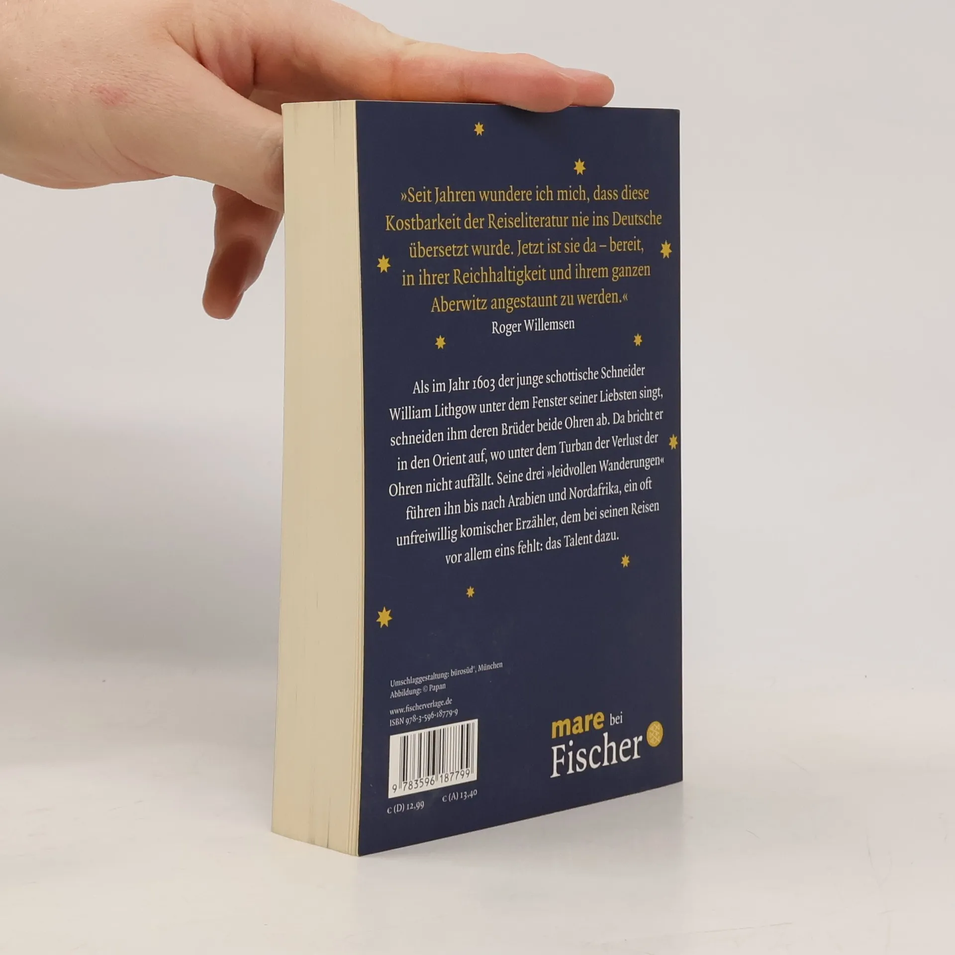 Als im Jahr 1603 der junge schottische Schneider William Lithgow unter dem Fenster seiner Liebsten singt, schneiden ihm deren Brüder beide Ohren ab. Da bricht er in den Orient auf, wo unter dem Turban der Verlust der Ohren nicht auffällt. Seine drei »leidvollen Wanderungen« führen ihn bis nach Arabien und Nordafrika, ein oft unfreiwillig komischer Erzähler, dem bei seinen Reisen vor allem eins fehlt: das Talent dazu. Erstmals auf Deutsch, mit einem ausführlichen Nachwort von Roger Willemsen
