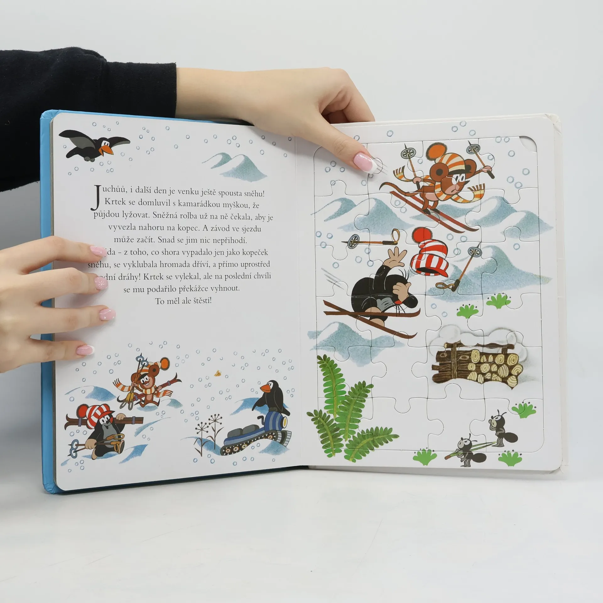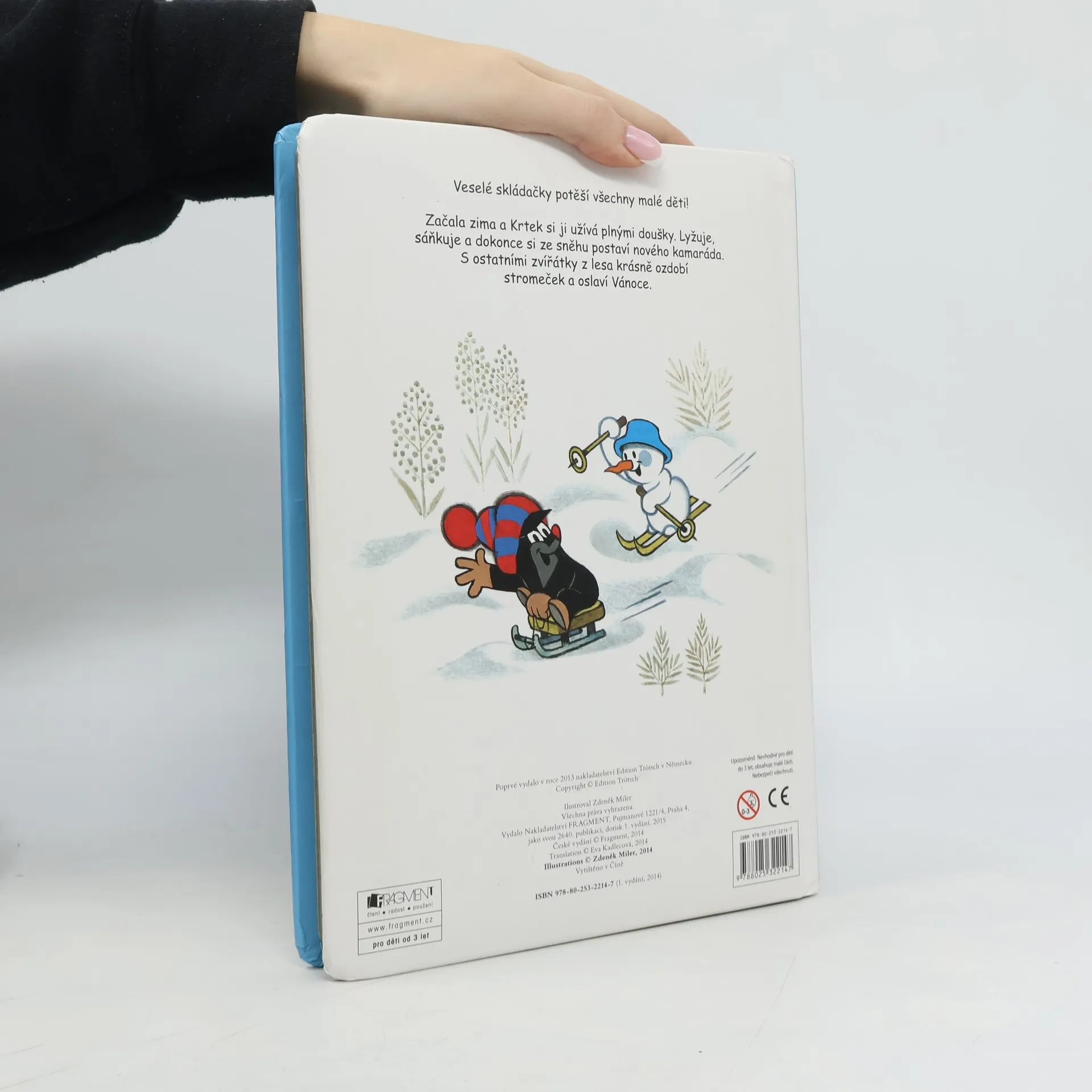 Kniha plná veselých skládaček potěší všechny malé děti. Začala zima a Krtek si ji užívá plnými doušky. Lyžuje, sáňkuje a dokonce si ze sněhu postaví nového kamaráda. S ostatními zvířátky z lesa krásně ozdobí stromeček a oslaví Vánoce. Kniha obsahuje 5 skládaček s 24 dílky.