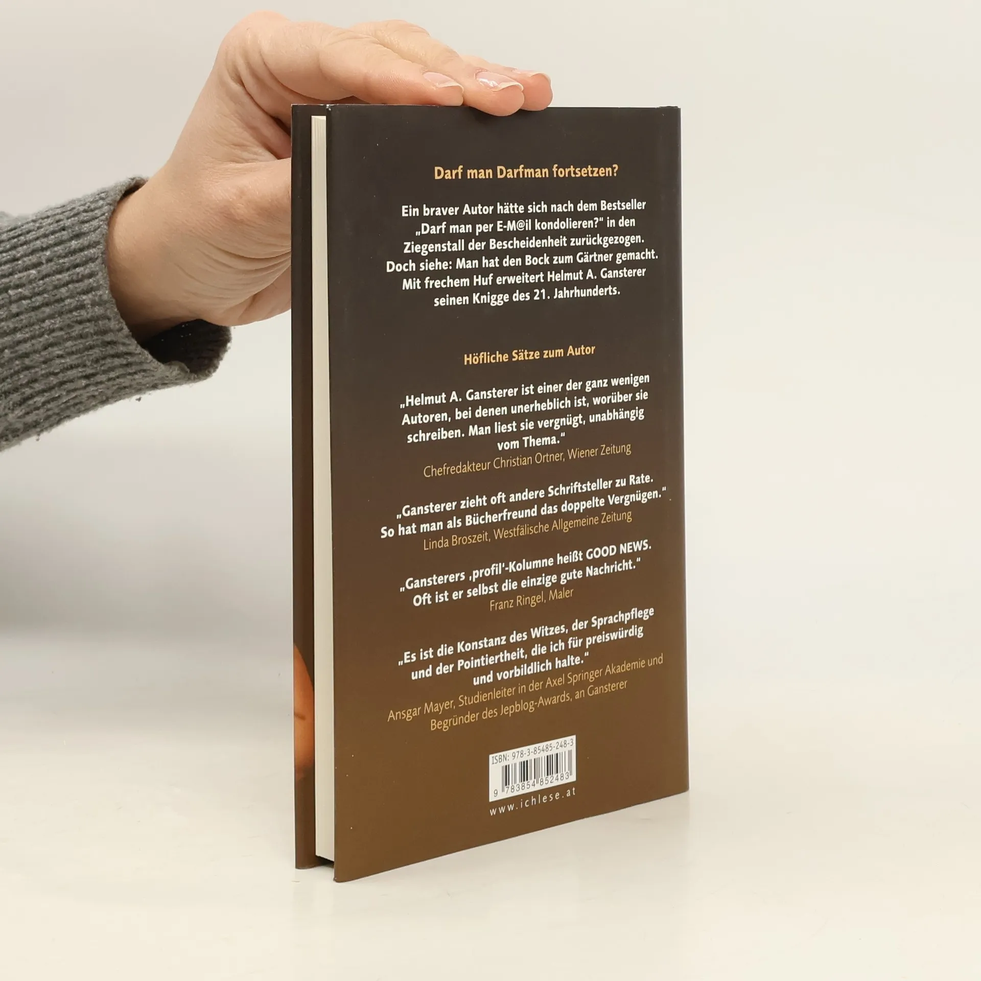 Nach seinen Erfolgs-Büchern „Darf man per E-Mail kondolieren?“ und „Der neue Mann von Welt“ legt Helmut A. Gansterer nun einen neuen Bestseller vor: In „Darf man als Nackerta ins Hawelka?“ pflügt er den Acker des richtigen Verhaltens. Er zupft alte Benimm-Regeln wie Unkraut aus. Mit Heiterkeit und flacher Hand wirft er eine Saat neuer Anweisungen, die für frisches Grün sorgt. Der ideale Umgang mit Mitmenschen hat nichts mehr mit mechanischen Regeln zu tun, die jeder Schimpanse auswendig lernen kann. Er verlangt echte Mitmenschlichkeit und hohe emotionale Intelligenz. Das Feld ist schier grenzenlos. Es umfasst auch diesmal wieder alle Lebensbereiche: Beruf und Karriere, Religion und Geist, Partnerschaft und Sex, Kleidung, Wohnen und Essen & Trinken.