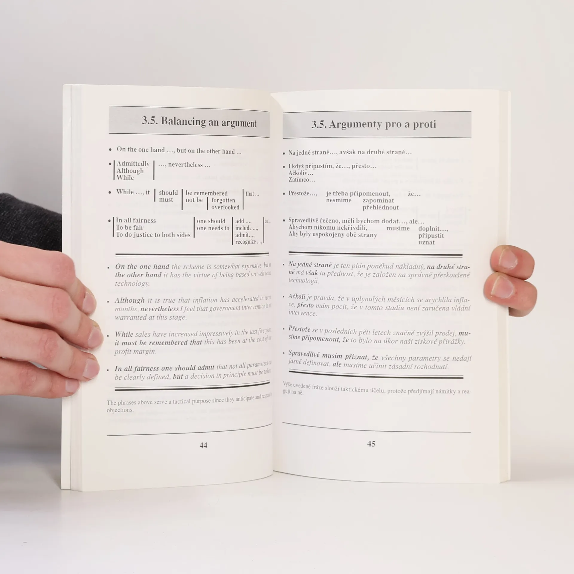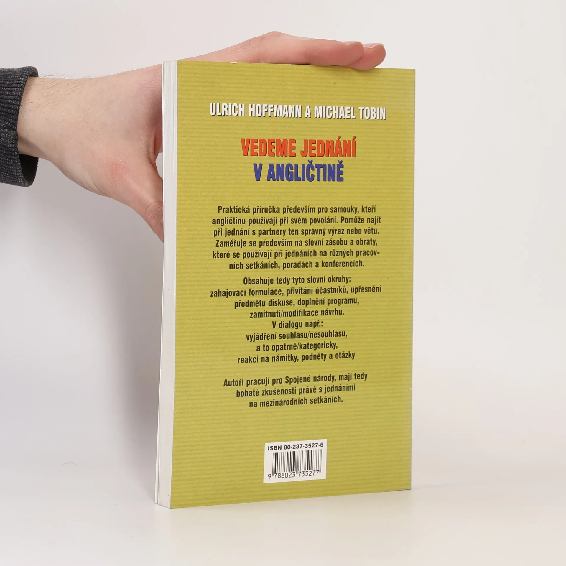 Praktická příručka především pro samouky, kteří angličtinu používají při svém povolání. Pomůže najít při jednání s partnery ten správný výraz nebo větu. Zaměřuje se především na slovní zásobu a obraty, které se používají při jednáních na různých pracovních setkáních, poradách a konferencích. Obsahuje tyto okruhy: zahajovací formulace, přivítání účastníků, upřesnění předmětu diskuse, doplnění programu, zamítnutí/modifikace návrhu. V dialogu např. vyjádření souhlasu/nesouhlasu, a to opatrně/kategoricky, reakci na námitky, podněty a otázky