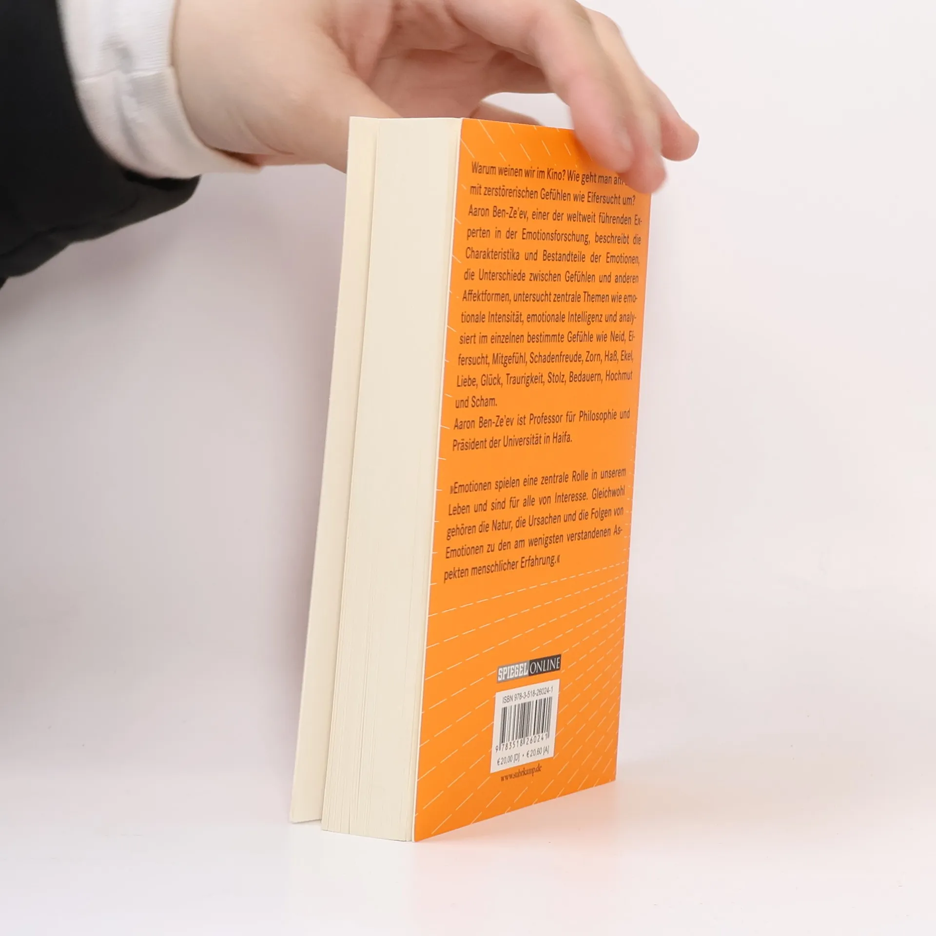 Warum weinen wir im Kino? Wie geht man am besten mit zerstörerischen Gefühlen wie Eifersucht um? Obwohl Gefühle unser ganzes Leben durchziehen, wurden ihre Natur, ihre Ursachen und ihre Wirkung erst in letzter Zeit von Sozialwissenschaftlern und Philosophen untersucht. Doch trotz des steigenden wissenschaftlichen Interesses an diesem Thema reichen die empirischen Ergebnisse immer noch nicht an unser intuitives Wissen heran. Im ersten Teil betrachtet Ben Ze'ev die typischen Charakteristika und Bestandteile der Emotionen, die Unterschiede zwischen Gefühlen und anderen affektiven Formen, er behandelt zentrale Themen wie emotionale Intelligenz, geregelte Emotionen, Emotion und Moralität. Der zweite Teil beschäftigt sich mit einzelnen Gefühlen: Neid, Eifersucht, Schadenfreude, Mitgefühl, Mitleid, Ärger, Haß, Abscheu, Liebe, Lust, sexuelles Begehren, Glück, Traurigkeit, Stolz, Bedauern und Scham.