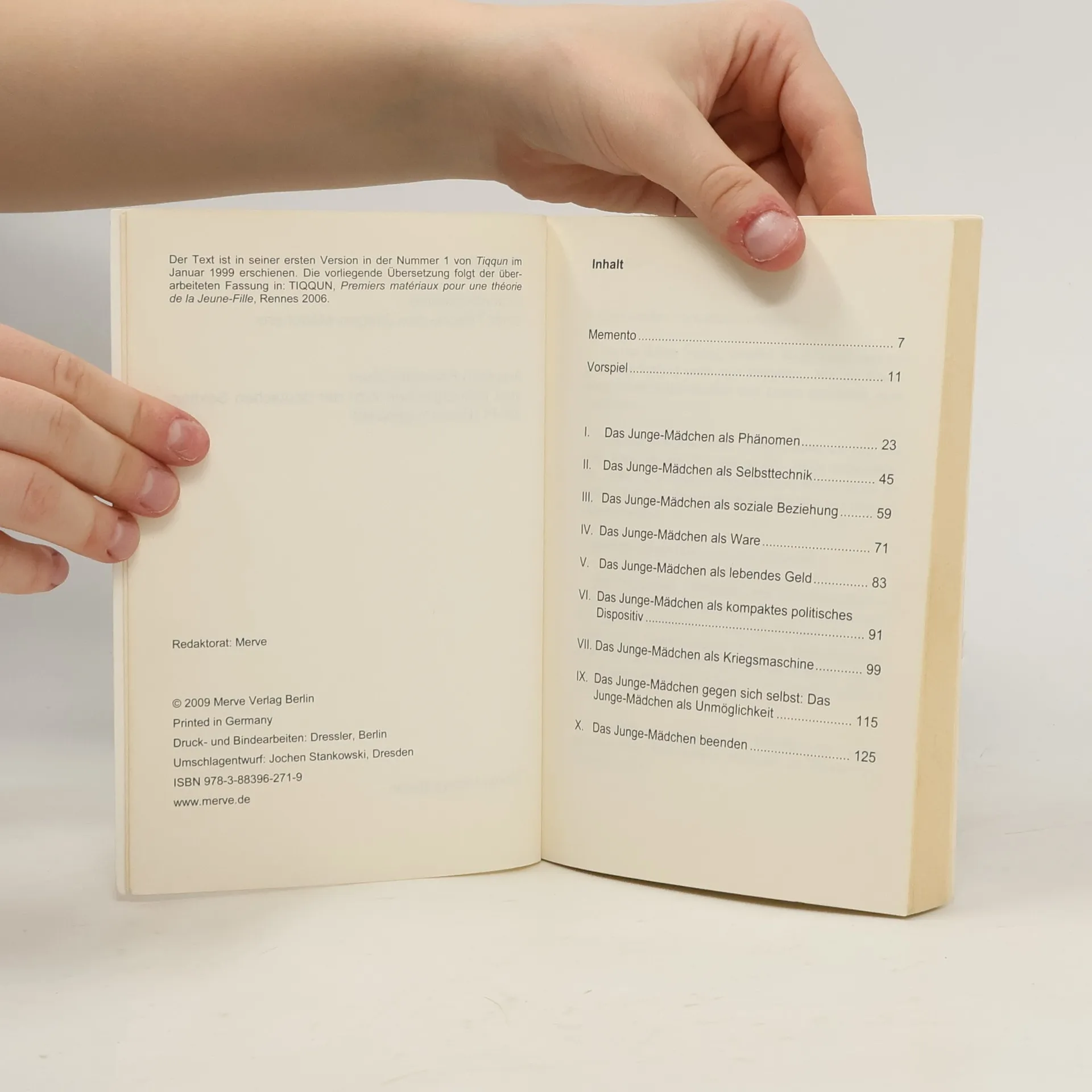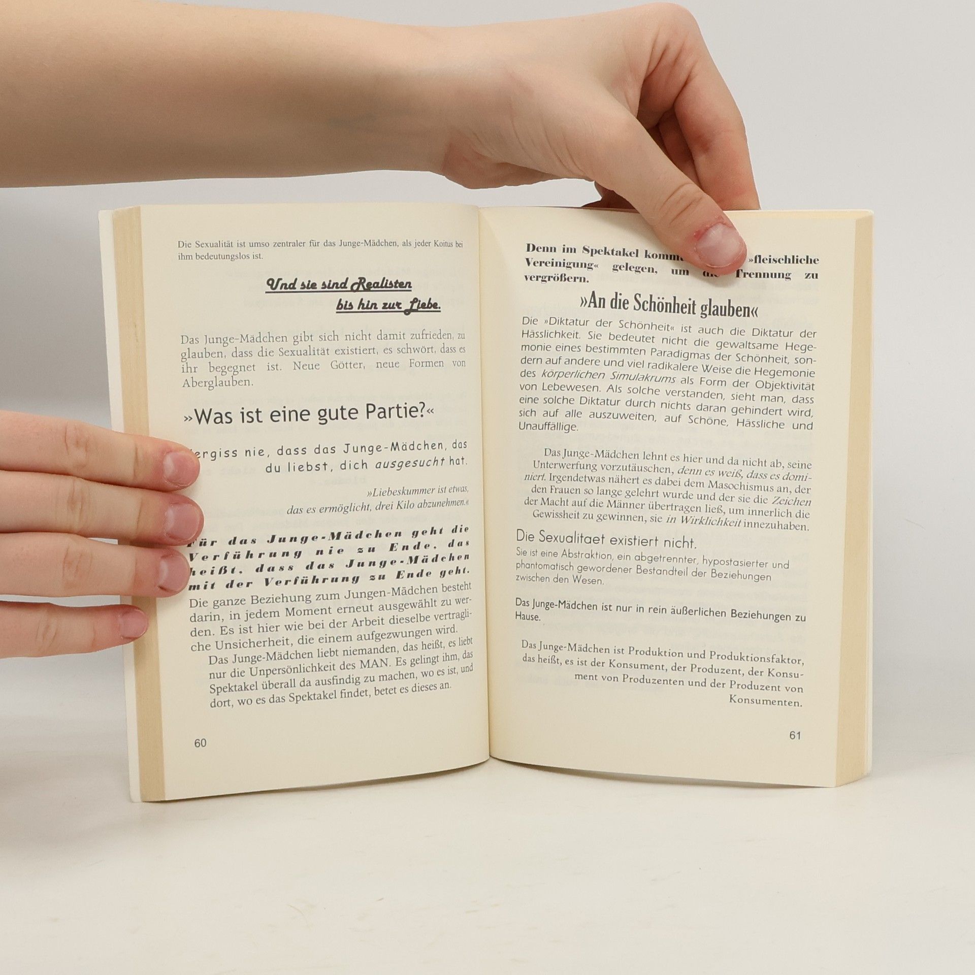Das Mädchen (la Jeune-Fille) ist die Gestalt, die Ewig-Weibliches und ewigeJugend in sich vereint. Seinen Ursprung hat es im Bankrott des von der totalenKommerzialisierung überrannten Feminismus. Einzig fähig zu konsumieren(sowohl in der Freizeit wie bei der Arbeit), ist das Mädchen zugleich dasluxuriöseste Konsumgut, das gegenwärtig in Umlauf ist: die Leit-Ware, diedazu dient, alle anderen zu verkaufen. Mit dem Mädchen wird Wirklichkeit,was sich nur die überdrehtesten Krämerseelen erträumten: die autonomeWare, die spricht und geht, die lebende Sache. Doch woran erkennt man es?Zunächst daran, dass es ist, was es zu sein scheint, sonst nichts. Zum zweitenhat alles, was das Mädchen tut, etwas Professionelles an sich, da esseine gesamte Existenz als eine Frage des Managements betrachtet. AlsEigentümerin ihres Körpers, verkauft das Mädchen ('Sternchen', Model,Reklame, Bild) seine 'Verführungskraft' wie man einst seine 'Arbeitskraft'verkaufte. Selbst seine Liebschaften sind Arbeit, und wie jede Arbeit prekär.Schließlich altert das Mädchen nicht, es verwest.