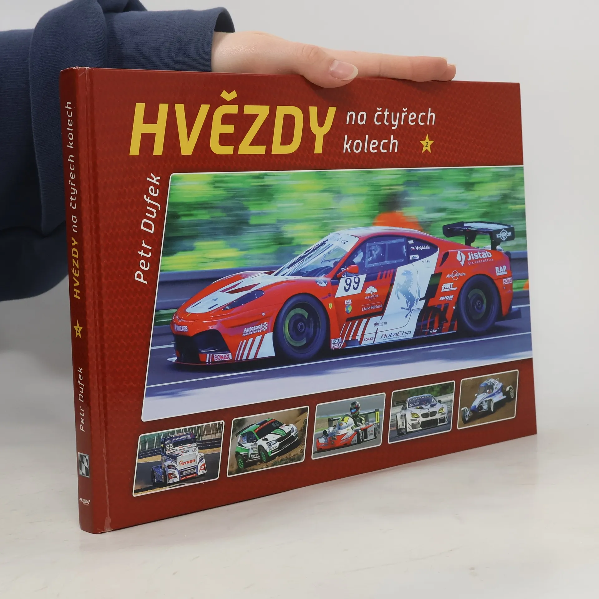 Kniha Hvězdy na čtyřech kolech přináší medailonky dvaceti předních českých automobilových závodníků, kteří dosáhli významných úspěchů na domácích i mezinárodních tratích. Jejich prostřednictvím se čtenář seznámí se strhující atmosférou i zákulisím velkých závodů, stejně jako s dramaty, která prožívají jejich aktéři. Autorem je zkušený motoristický novinář Petr Dufek, který během své čtyřicetileté kariéry navštívil víc než tisíc automobilových závodů. Publikace je bohatě ilustrována fotografiemi špičkových českých i zahraničních fotoreportérů.