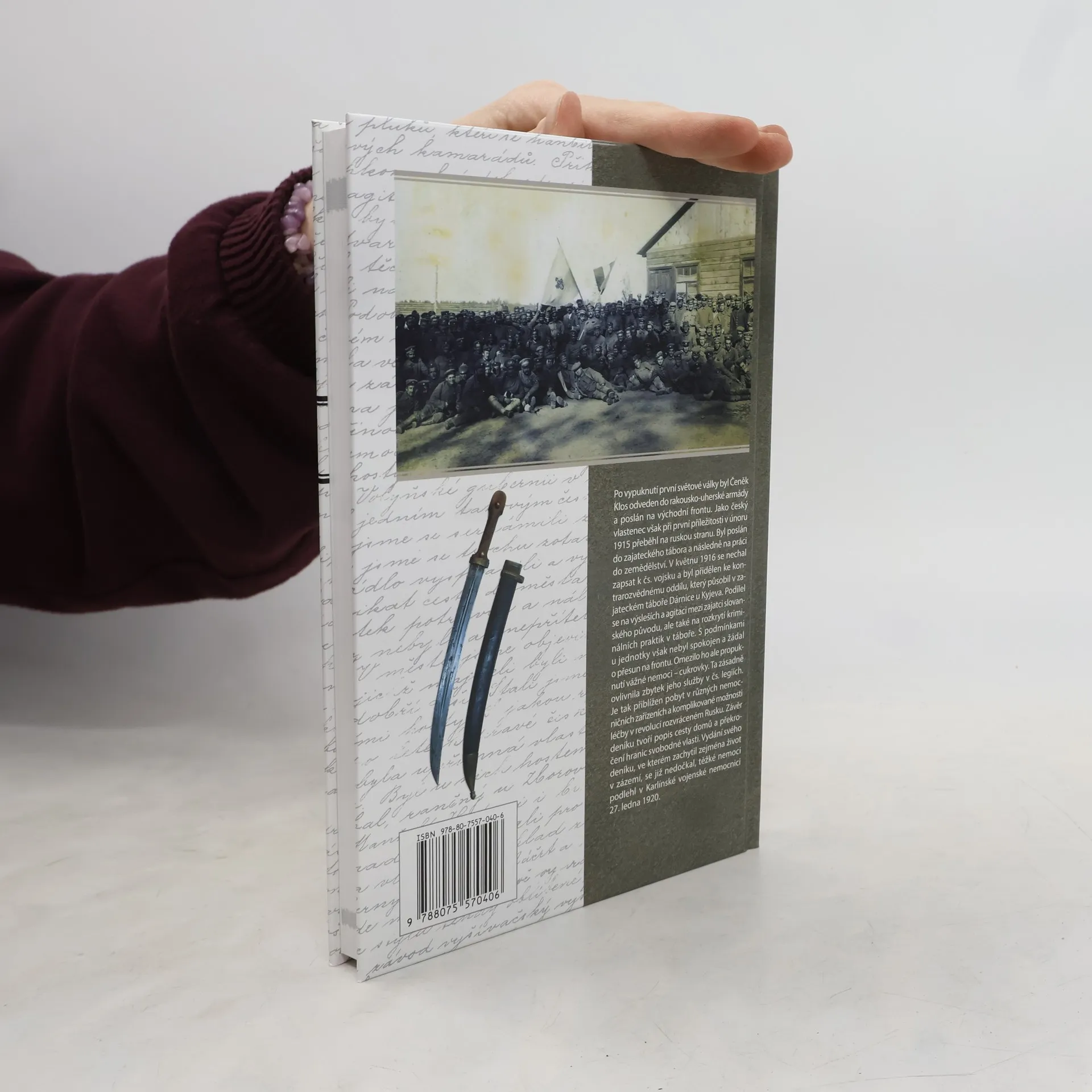 Deník ruského legionáře Čeňka Klose. Po vypuknutí první světové války byl Čeněk Klos odveden do rakousko-uherské armády a poslán na východní frontu. Jako český vlastenec však při první příležitosti v únoru 1915 přeběhl na ruskou stranu. Byl poslán do zajateckého tábora a následně na práci do zemědělství. V květnu 1916 se nechal zapsat k čs. vojsku a byl přidělen ke kontrarozvědnému oddílu, který působil v zajateckém táboře Dárnice u Kyjeva. Podílel se na výsleších a agitaci mezi zajatci slovanského původu, ale také na rozkrytí kriminálních praktik v táboře. S podmínkami u jednotky však nebyl spokojen a žádal o přesun na frontu. Omezilo ho ale propuknutí vážné nemoci – cukrovky. Ta zásadně ovlivnila zbytek jeho služby v čs. legiích. Je tak přiblížen pobyt v různých nemocničních zařízeních a komplikované možnosti léčby v revolucí rozvráceném Rusku. Závěr deníku tvoří popis cesty domů a překročení hranic svobodné vlasti. Vydání svého deníku, ve kterém zachytil zejména život v zázemí, se již nedočkal, své těžké nemoci podlehl v Karlínské vojenské nemocnici 27. ledna 1920.