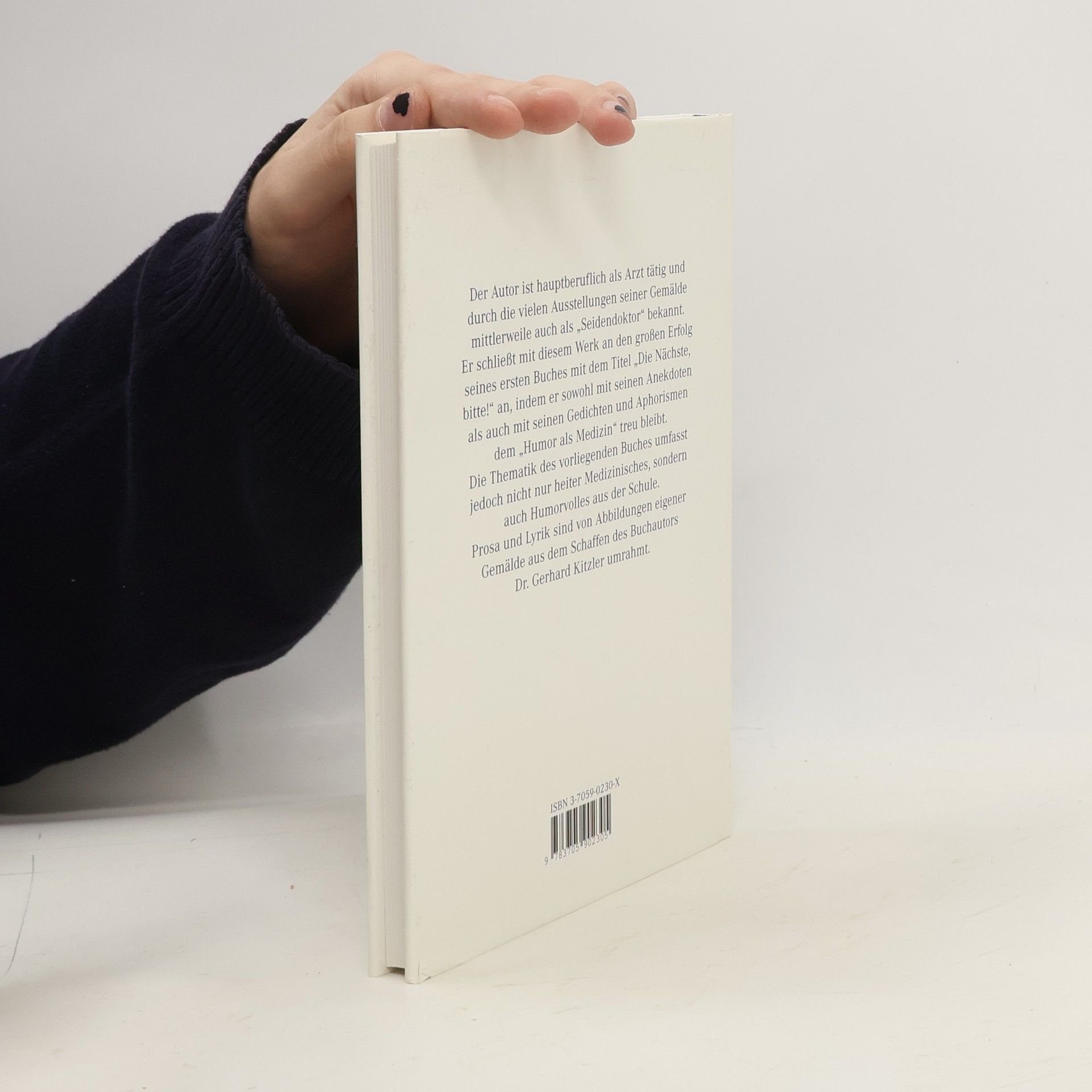 Der Autor ist hauptberuflich als Arzt tätig und durch die vielen Ausstellungen seiner Gemälde mittlerweile auch als "Seidendoktor" bekannt. Er schließt mit diesem Werk an den großen Erfolg seines ersten Buches mit dem Titel "Die Nächste, bitte!" an, indem er sowohl mit seinen Anekdoten als auch mit seinen Gedichten und Aphorismen dem "Humor als Medizin" treu bleibt. Die Thematik des vorliegenden Buches umfasst jedoch nicht nur heiter Medizinisches, sondern auch Humorvolles aus der Schule. Prosa und Lyrik sind von Abbildungen eigener Gemälde aus dem Schaffen des Buchautors Dr. Gerhard Kitzler umrahmt.