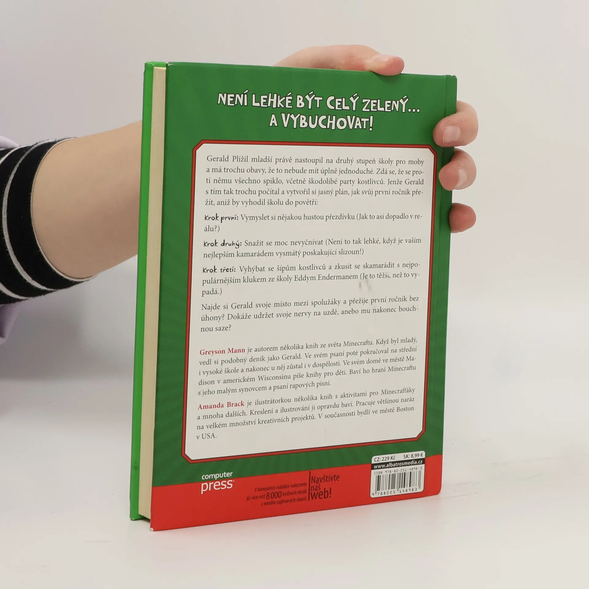 Odhalte tajné životy mobů v Minecraftu díky zábavnému deníku plížila Geralda! Není lehké být zelený… a vybuchovat! Gerald Plížil mladší právě nastoupil na druhý stupeň školy pro moby a má trochu obavy, že to nebude mít úplně jednoduché. Zdá se, že se proti němu všechno spiklo, včetně škodolibé party kostlivců. Jenže Gerald s tím tak trochu počítal a vytvořil si jasný plán, jak svůj první ročník přežít, aniž by vyhodil školu do povětří: Krok první: Vymyslet si nějakou hustou přezdívku (Jak to asi dopadlo v reálu?) Krok druhý: Snažit se moc nevyčnívat (Není to tak lehké, když je vaším nejlepším kamarádem vysmátý poskakující slizoun!) Krok třetí: Vyhýbat se šípům kostlivců a zkusit se skamarádit s nejpopulárnějším klukem ze školy Eddym Endermanem (Není to tak lehké, jak to vypadá.) Najde si Gerald svoje místo mezi spolužáky a přežije první ročník bez úhony? Dokáže udržet svoje nervy na uzdě anebo mu nakonec bouchnou saze?