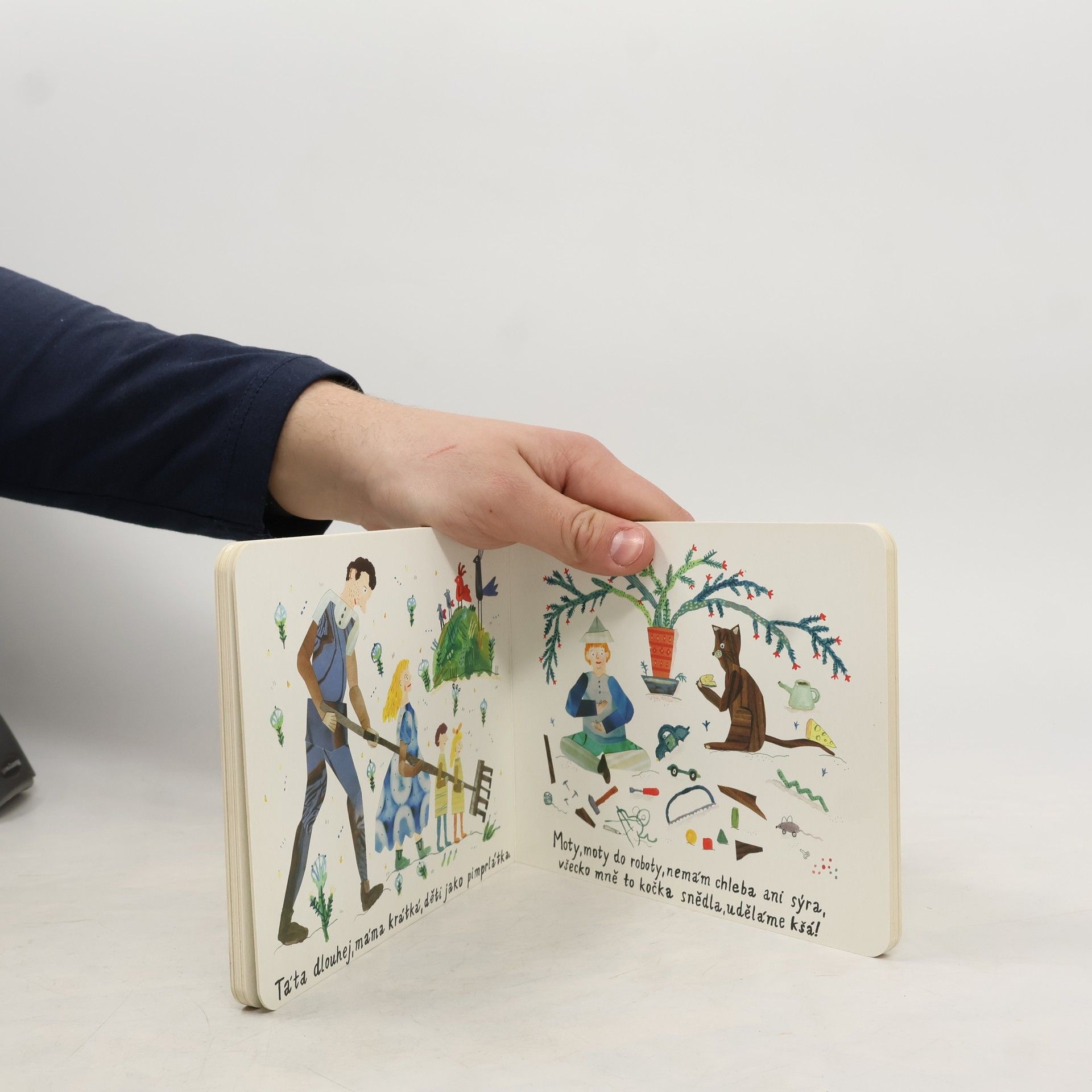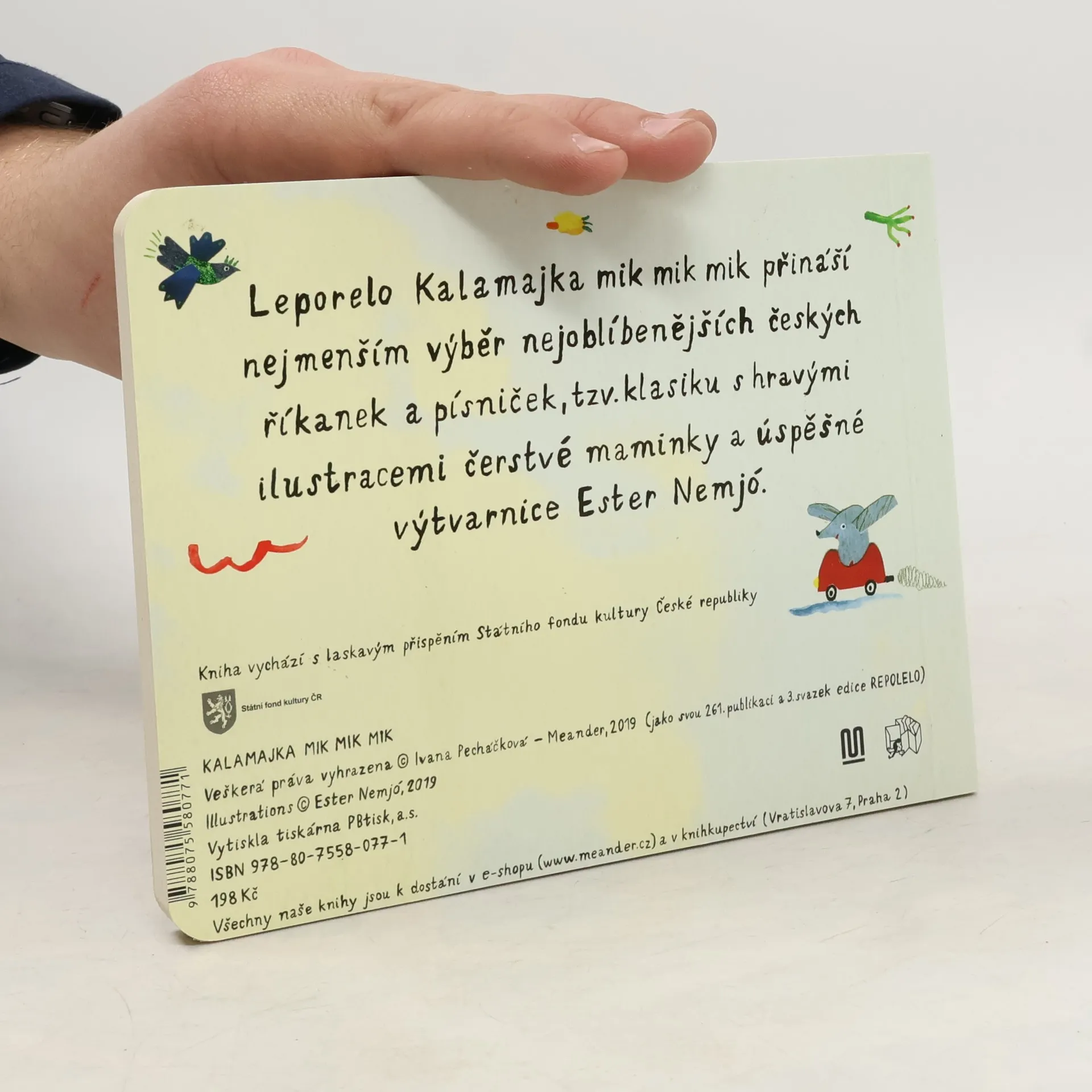 Leporelo Kalamajka mik mik mik přináší nejmenším výběr nejoblíbenějších českých říkanek, básniček a písniček, tzv. klasiku s krásnými ilustracemi a ručním písmem čerstvé maminky a úspěšné ilustrátorky Ester Nemjó.