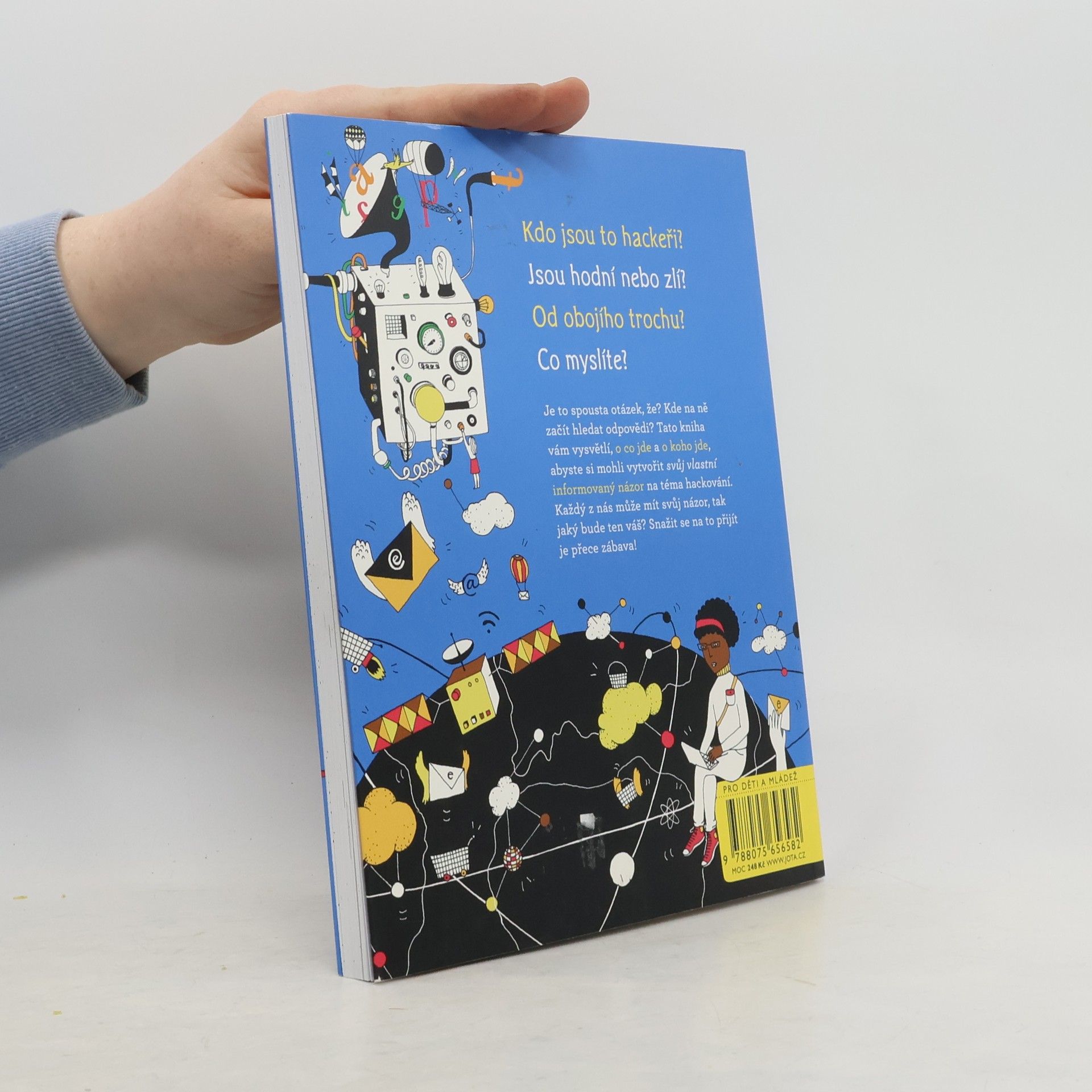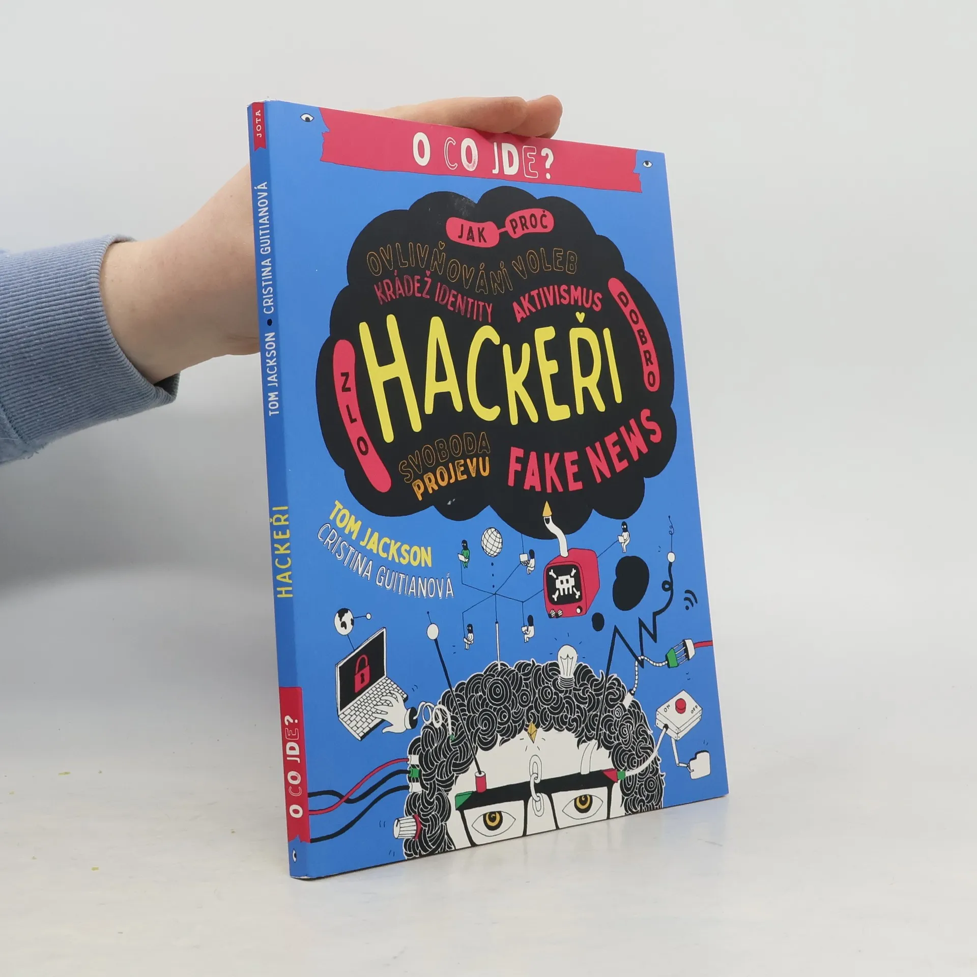 Kdo jsou to hackeři? Jsou hodní nebo zlí? Od obojího trochu? Co myslíte? Je to spousta otázek, že? Kde na ně začít hledat odpovědi? Tato kniha vám vysvětlí, o co jde a o koho jde, abyste si dokázali vytvořit svůj vlastní informovaný názor na téma hackování. Každý z nás může mít svůj názor, tak jaký bude ten váš? Snažit se na to přijít je přece zábava! Měl by být státům umožněn přístup k záznamům veškeré komunikace? Jakou míru soukromí by měl člověk očekávat? Komu patří internet? Tento fascinující úvod do široké problematiky internetu a internetové bezpečnosti vám tyto otázky přiblíží skrze témata jako špionáž, šifrování a temný web. Knižní série O co jde? vás vyzbrojí vědomostmi, díky nimž dokážete obhájit své argumenty a své přesvědčení s jistotou. Každý z nás může mít svůj názor, tak ať je ten váš opřený o informace. Série se zabývá napínavými tématy mnoha článků a veřejných debat, nad kterými jistě stojí za to se zamyslet. Ptá se, „proč se vlastně kolem toho dělá takový povyk“, předkládá klíčová fakta a zkoumá to, co je dobré i špatné na každém případu. V těchto knihách najdou mladí čtenáři vše, co potřebují vědět o současných důležitých tématech, a budou si tak moci vytvořit svůj vlastní názor.