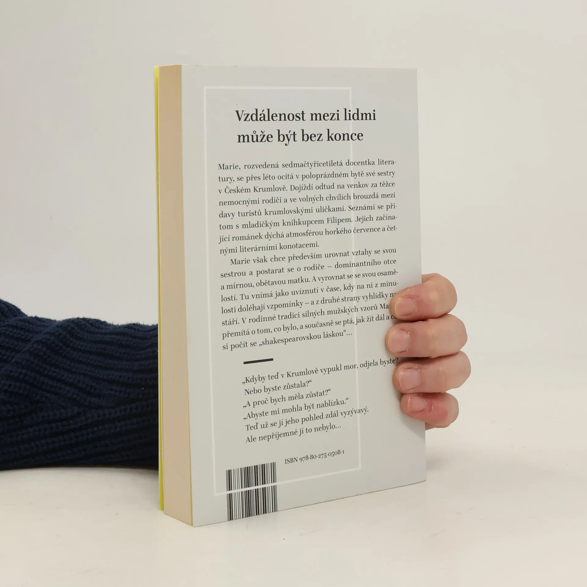 Román předního českého prozaika, odehrávající se jak v kulisách jihočeského venkova, tak i v malebném prostředí Českého Krumlova, se zamýšlí nad napjatými rodinnými vztahy, lidskou osamělostí i nečekaným dotekem pozdního citového okouzlení. Marie, vysokoškolská učitelka angloamerické literatury opouští dočasně pražskou metropoli a odjíždí navštívit rodiče. Čas je neúprosný a matka s otcem se potýkají s nemocemi, jež se ve vyšším věku přirozeně dostavují. Marie ovšem zjišťuje, že idealistický obraz jihočeského venkova, který si pamatovala z dětství, dávno zmizel. V původním domově se vzhledem k dlouhé nepřítomnosti stává cizincem a k vyrovnanému stavu její mysli nepřispívá ani nedávno rozpadlé manželství, ani napětí mezi ní a její poněkud dominantní sestrou. A i když se v nedalekém Krumlově rýsuje dojemně selankovitý vztah s mladým knihkupcem, Marie ví, že není čas na snění. Že tu jsou traumata z minulosti, strach ze smrti nejbližších či téměř nesmiřitelné odcizení s vlastním sourozencem. Že zmizely útulnost a bezpečí, ale přece jen je možné jako symbol naděje zahlédnout "bílé plachty na modré hladině" nebo něco podobného.