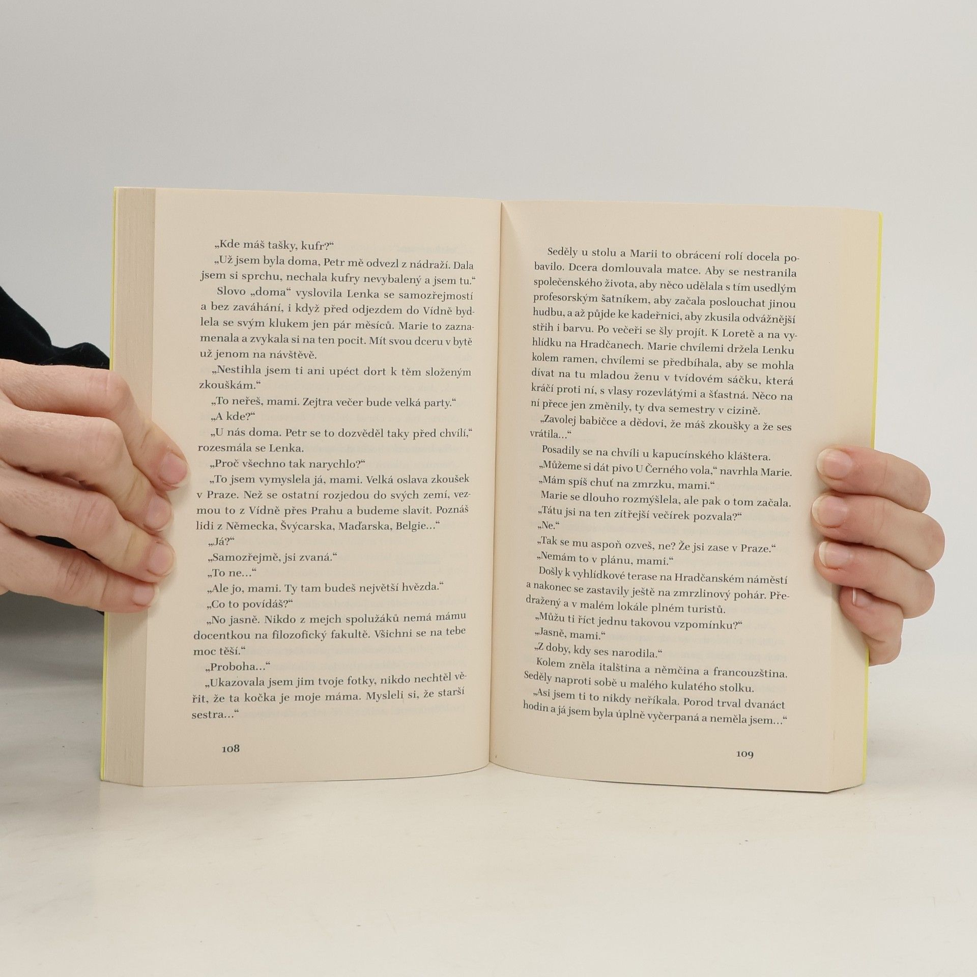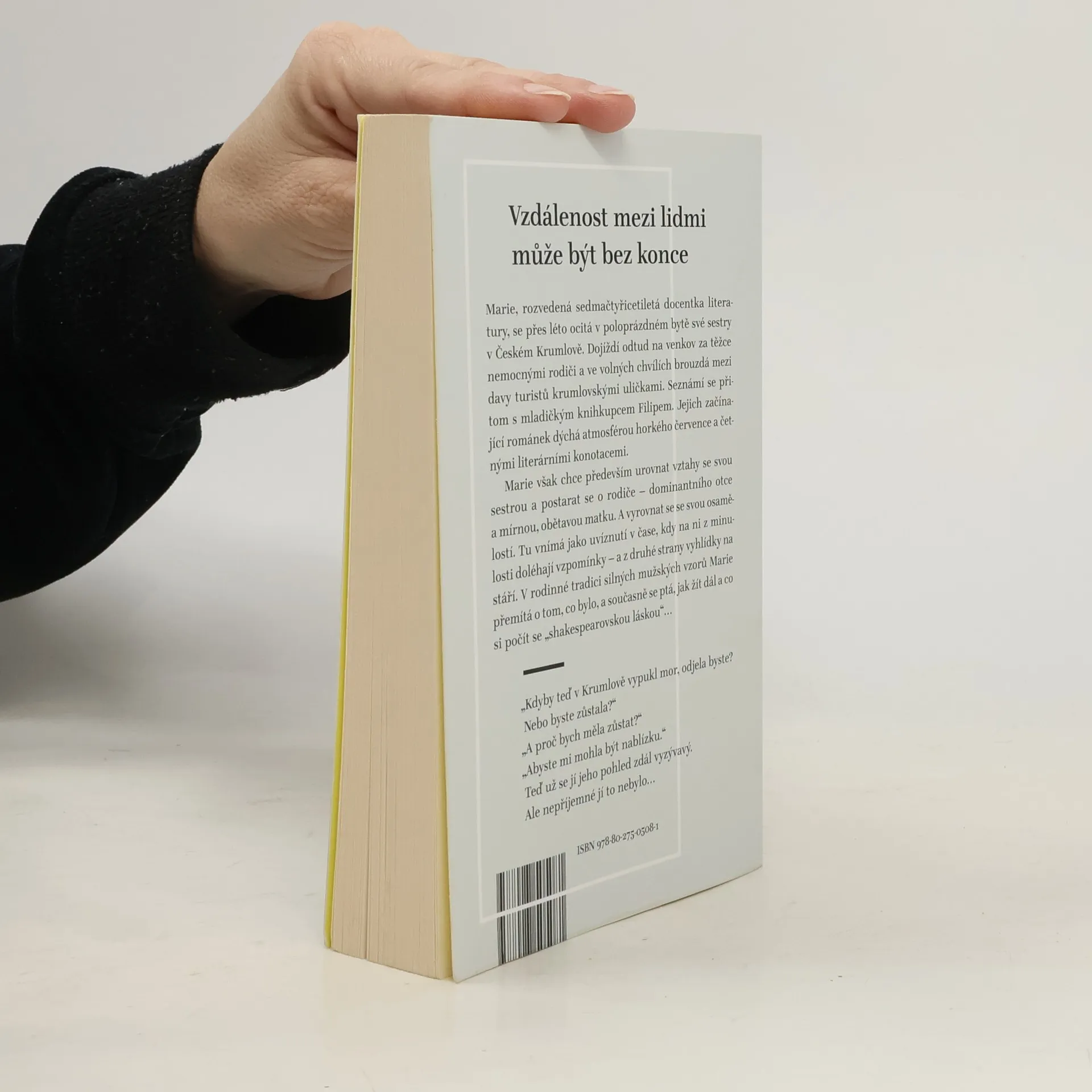 Román předního českého prozaika, odehrávající se jak v kulisách jihočeského venkova, tak i v malebném prostředí Českého Krumlova, se zamýšlí nad napjatými rodinnými vztahy, lidskou osamělostí i nečekaným dotekem pozdního citového okouzlení. Marie, vysokoškolská učitelka angloamerické literatury opouští dočasně pražskou metropoli a odjíždí navštívit rodiče. Čas je neúprosný a matka s otcem se potýkají s nemocemi, jež se ve vyšším věku přirozeně dostavují. Marie ovšem zjišťuje, že idealistický obraz jihočeského venkova, který si pamatovala z dětství, dávno zmizel. V původním domově se vzhledem k dlouhé nepřítomnosti stává cizincem a k vyrovnanému stavu její mysli nepřispívá ani nedávno rozpadlé manželství, ani napětí mezi ní a její poněkud dominantní sestrou. A i když se v nedalekém Krumlově rýsuje dojemně selankovitý vztah s mladým knihkupcem, Marie ví, že není čas na snění. Že tu jsou traumata z minulosti, strach ze smrti nejbližších či téměř nesmiřitelné odcizení s vlastním sourozencem. Že zmizely útulnost a bezpečí, ale přece jen je možné jako symbol naděje zahlédnout "bílé plachty na modré hladině" nebo něco podobného.