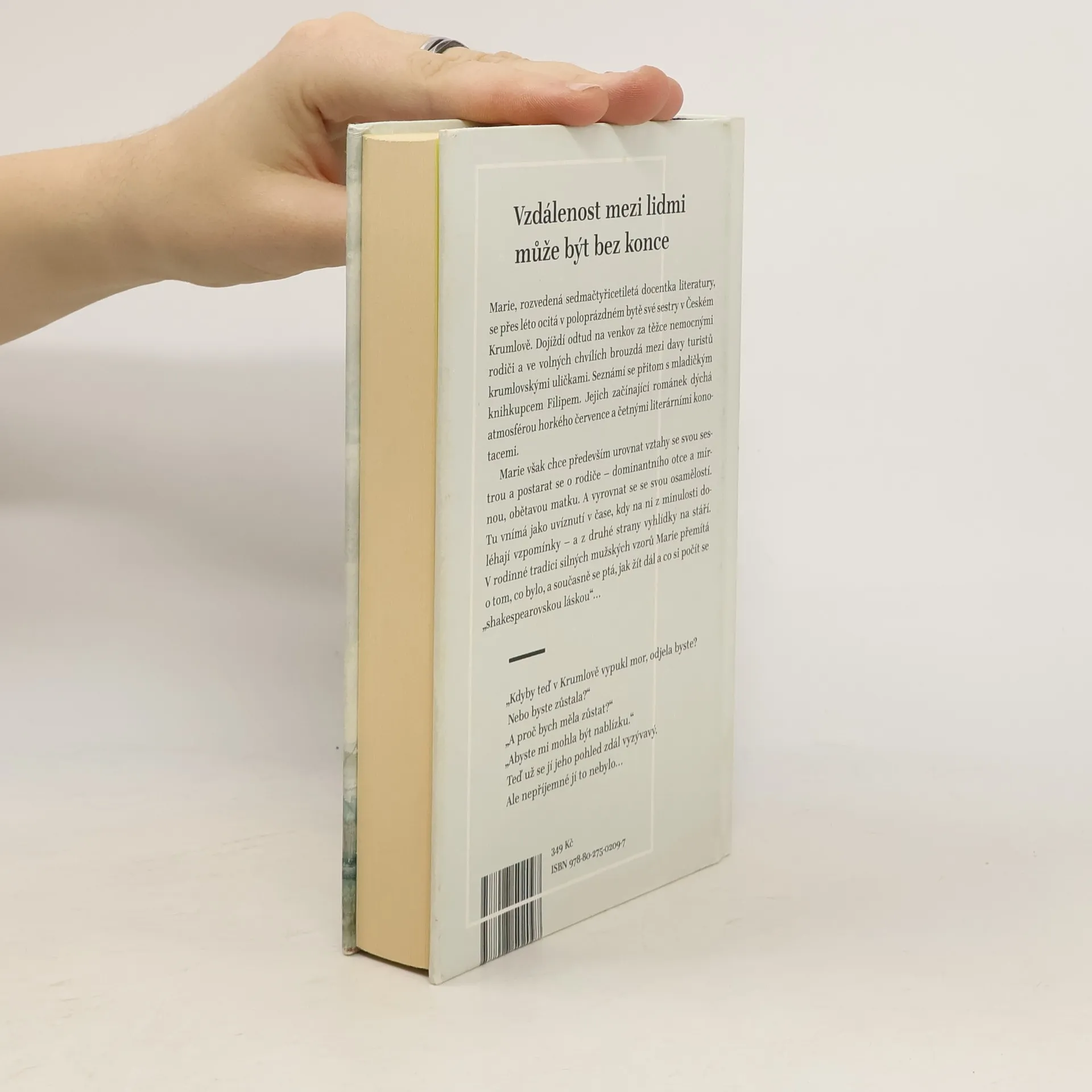 Marie, rozvedená sedmačtyřicetiletá docentka literatury, se přes léto ocitá v poloprázdném bytě své sestry v Českém Krumlově. Dojíždí odtud na venkov za těžce nemocnými rodiči a ve volných chvílích brouzdá mezi davy turistů krumlovskými uličkami. Seznámí se přitom s mladičkým knihkupcem Filipem. Jejich začínající románek dýchá atmosférou horkého července a četnými literárními konotacemi. Marie však chce především urovnat vztahy se svou sestrou a postarat se o rodiče – dominantního otce a mírnou, obětavou matku. A vyrovnat se se svou osamělostí. Tu vnímá jako uvíznutí v čase, kdy na ni z minulosti doléhají vzpomínky – a z druhé strany vyhlídky na stáří. V rodinné tradici silných mužských vzorů Marie přemítá o tom, co bylo, a současně se ptá, jak žít dál a co si počít se „shakespearovskou láskou“…