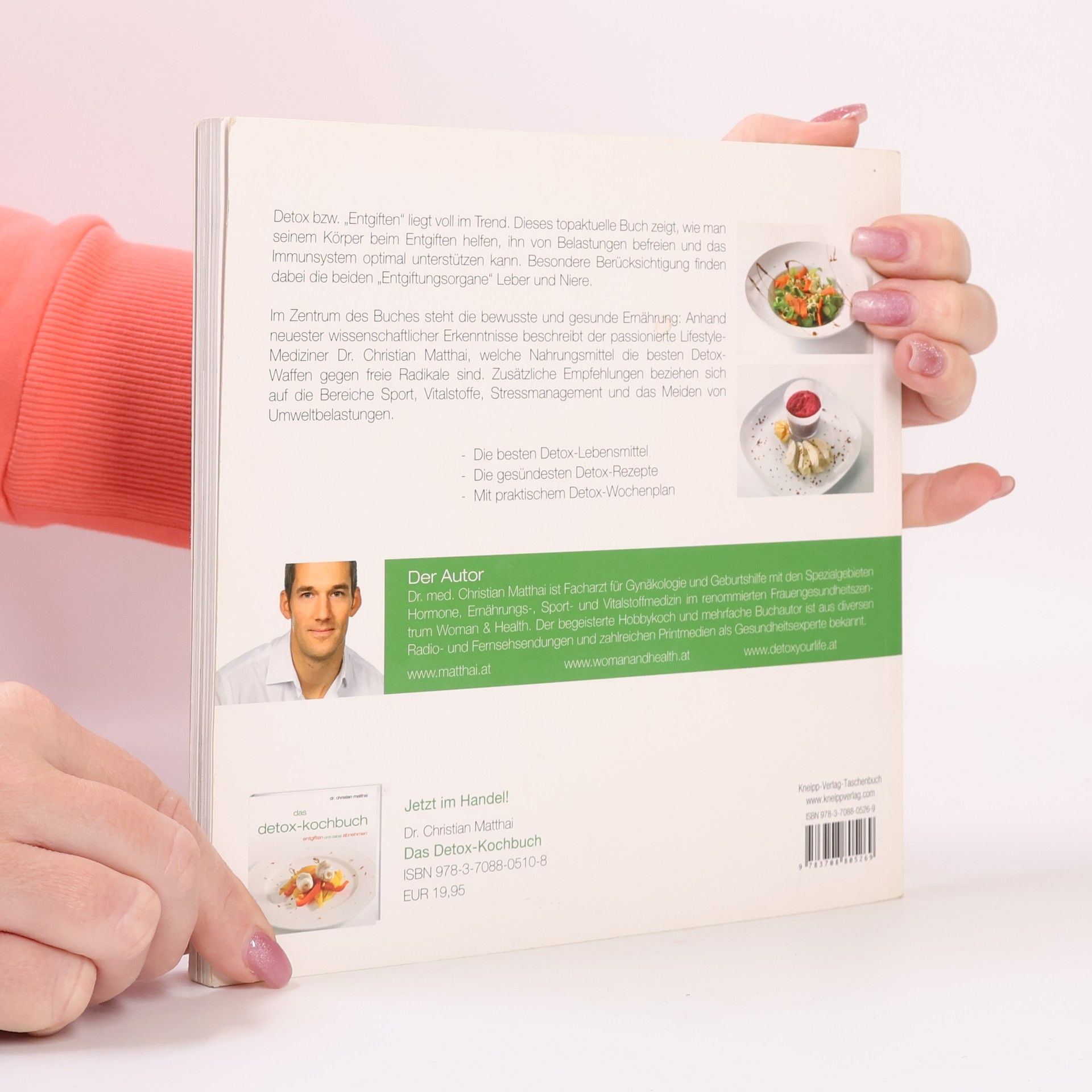 Der Lifestyletrend „Entgiften“ jetzt als Taschenbuch! Mit dem Thema „Detox“ bzw. „Entgiften“ hat Lifestylemediziner Dr. Christian Matthai den Zeitgeist perfekt getroffen. Deshalb gibt es seinen Spitzentitel nun als Taschenbuch. Das Buch zeigt, wie man seinen Körper beim Entgiften unterstützen kann und welche Nahrungsmittel die besten Detox-Waffen gegen freie Radikale sind. Ergänzt wird das Buch durch wertvolle Tipps, kulinarische Detox-Rezepte und einen Detox-Wochenplan. Aus dem Inhalt: Was unseren Körper belastet. Was bedeutet „Detoxing“? Ihr Detox-Programm. Detox-Food: Von Açai bis Zimt. Matthais Detox-Rezepte.