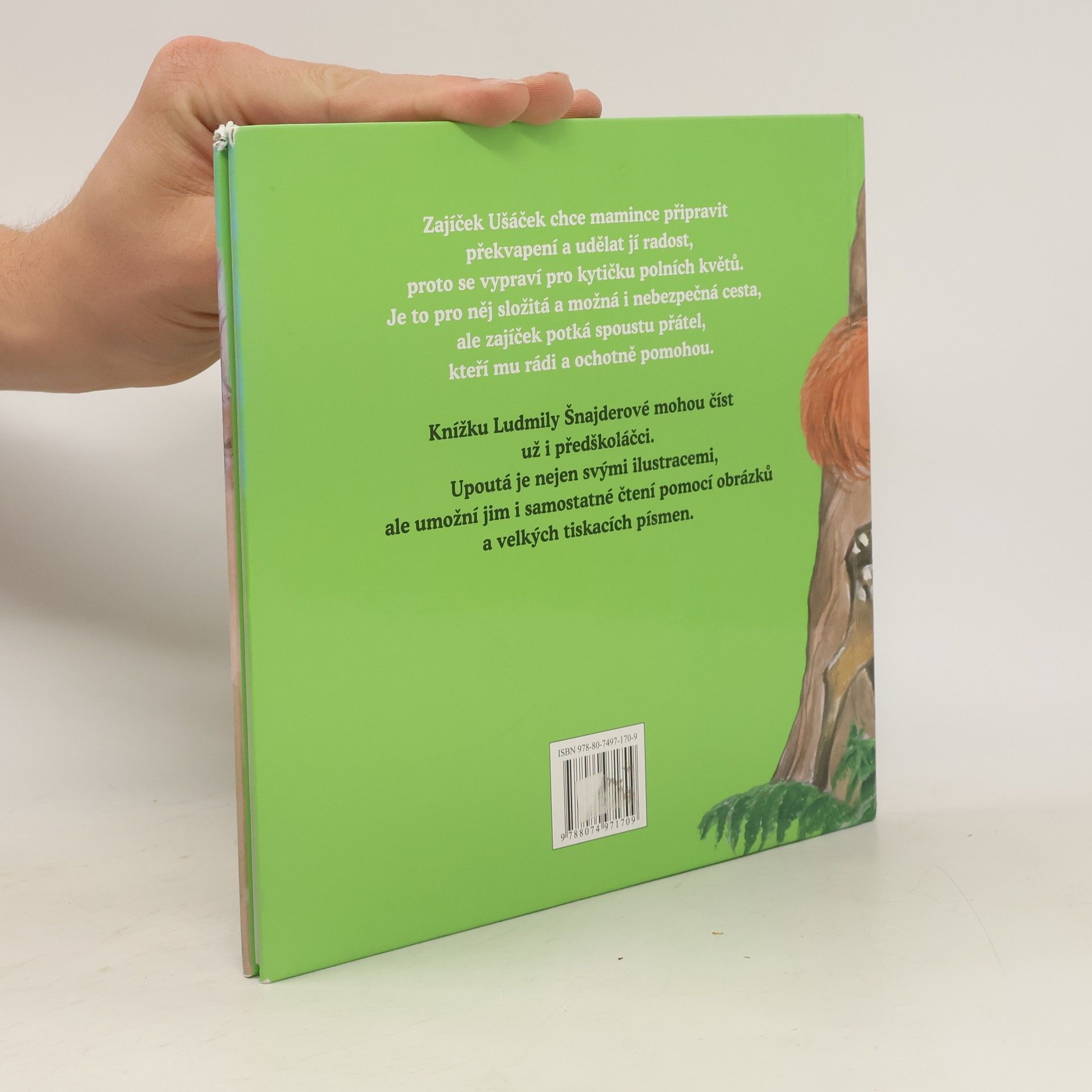 Zajíček Ušáček chce mamince připravit překvapení a udělat jí radost, proto se vypraví pro kytičku polních květů. Je to pro něj složitá a možná i nebezpečná cesta, ale zajíček potká spoustu přátel, kteří mu rádi a ochotně pomohou. Knížku Ludmily Šnajderové mohou číst už i předškoláčci. Upoutá je nejen svými ilustracemi, ale umožní jim i samostatné čtení pomocí obrázků a velkých tiskacích písmen.