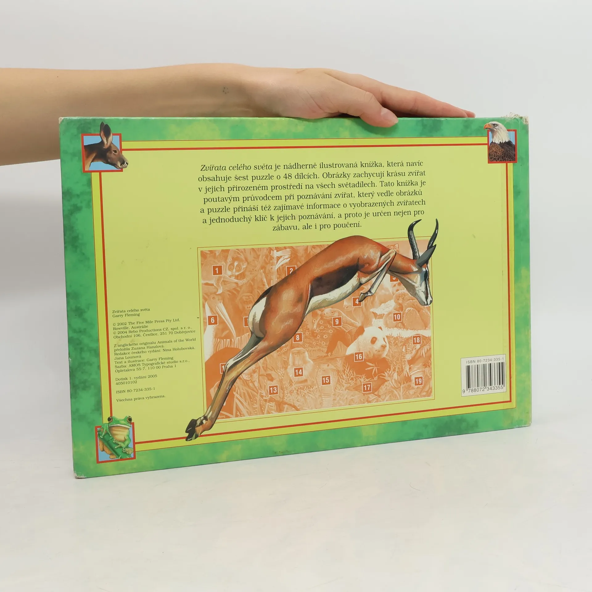Nádherně ilustrovaná knížka, která navíc obsahuje šest puzzle o 48 dílcích. Obrázky zachycují krásu zvířat v jejich přirozeném prostředí na všech světadílech. Knížka je poutavým průvodcem při poznávání zvířat, který vedle obrázků a puzzle přináší i zajímavé informace o zvířatech a jednoduchý klíč k jejich poznávání, je tedy určen nejen pro zábavu, ale i pro poučení.