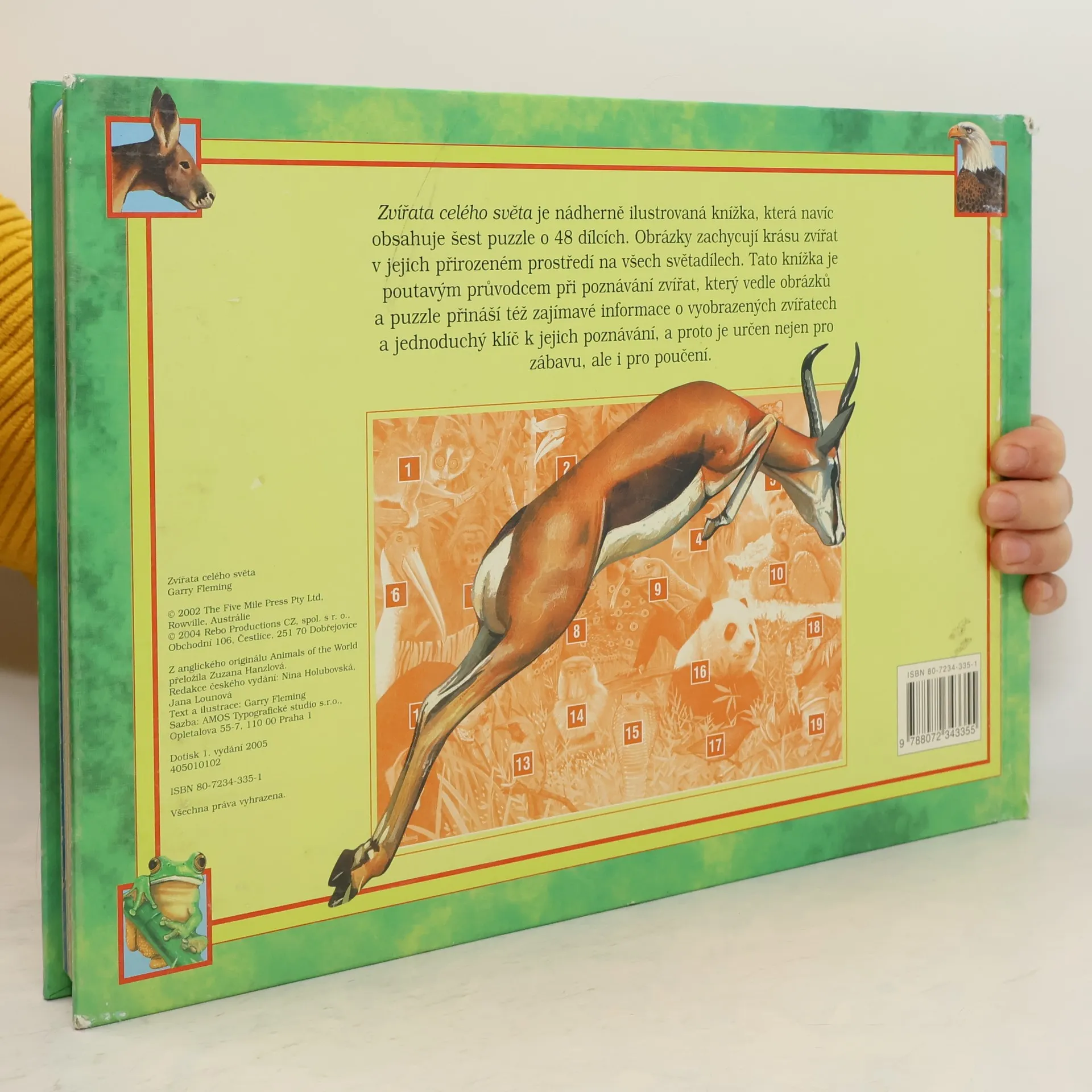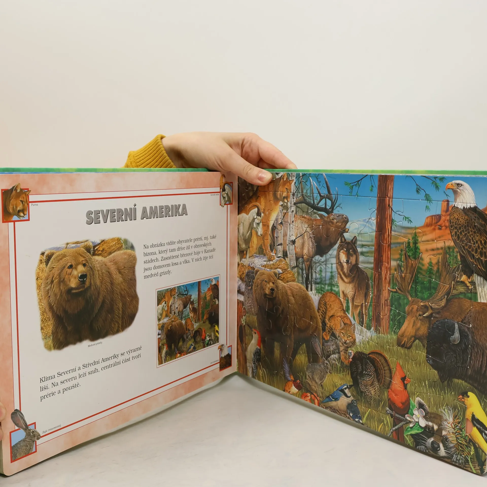 Nádherně ilustrovaná knížka, která navíc obsahuje šest puzzle o 48 dílcích. Obrázky zachycují krásu zvířat v jejich přirozeném prostředí na všech světadílech. Knížka je poutavým průvodcem při poznávání zvířat, který vedle obrázků a puzzle přináší i zajímavé informace o zvířatech a jednoduchý klíč k jejich poznávání, je tedy určen nejen pro zábavu, ale i pro poučení.