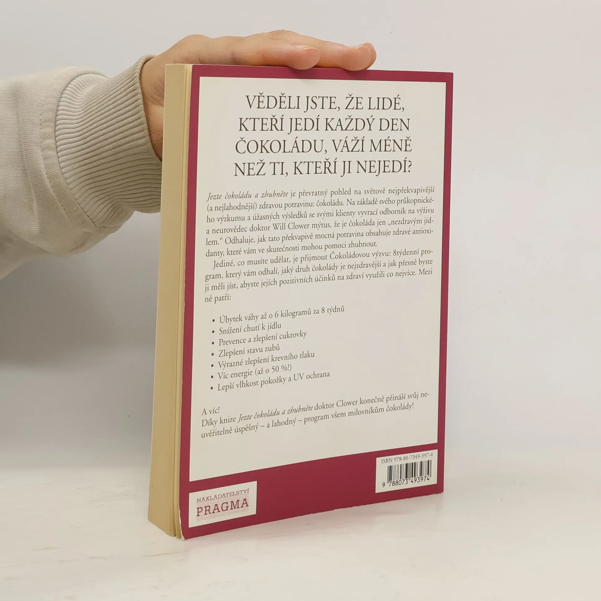 Myslíte si, že hubnutí znamená jen týdny odříkání, nekonečného cvičení a hladovění, abyste nakonec své pracně shozené kilogramy nabrali zpět? S programem doktora Clowera můžete jíst všechny potraviny a s pomocí čokolády budete ovládat jejich množství. Přesně tuto schopnost a mnoho dalších pozitivních vlastností má kakaový prášek obsažený v kvalitní tmavé čokoládě. Naučte se snadno a chutně, jak můžete jíst a žít zdravěji, a navíc i hubnout!