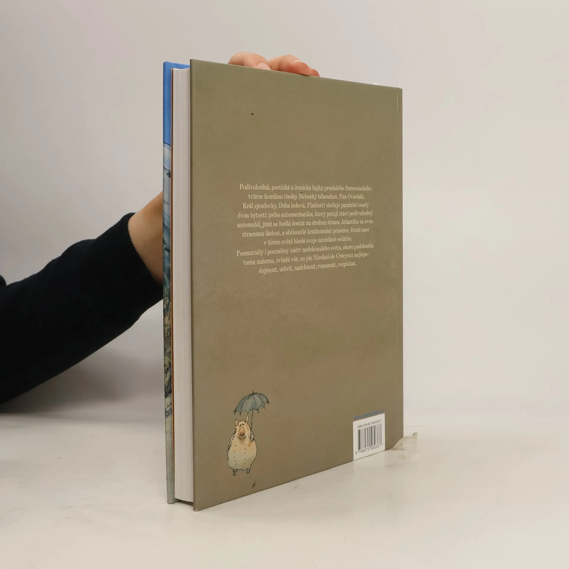 Podivuhodná, poetická a ironická bajka proslulého francouzského tvůrce komiksů (česky vyšlo Nebeský bibendum, Pan Ovocňák, Král sjezdovky, Doba ledová, Flašinet) sleduje paralelní osudy dvou bytostí. V první řadě tu máme psího automechanika, který potají staví podivuhodný automobil, jímž se hodlá dostat na druhou stranu Atlantiku za svou ztracenou láskou. Druhou představitelkou je obtloustlá krátkozraká prasnice, která v širém světě hledá svoje zatoulané selátko. Posmutnělý i posměšný náčrt nedokonalého světa, skoro podobného tomu našemu, zvládá vše, co umí Nicolas de Crécy nejlépe: dojmout, udivit, nadchnout, rozesmát, rozplakat. Nenechte si jeho nový fantaskní příběh s působivými, avšak křehkými ilustracemi, ujít.
