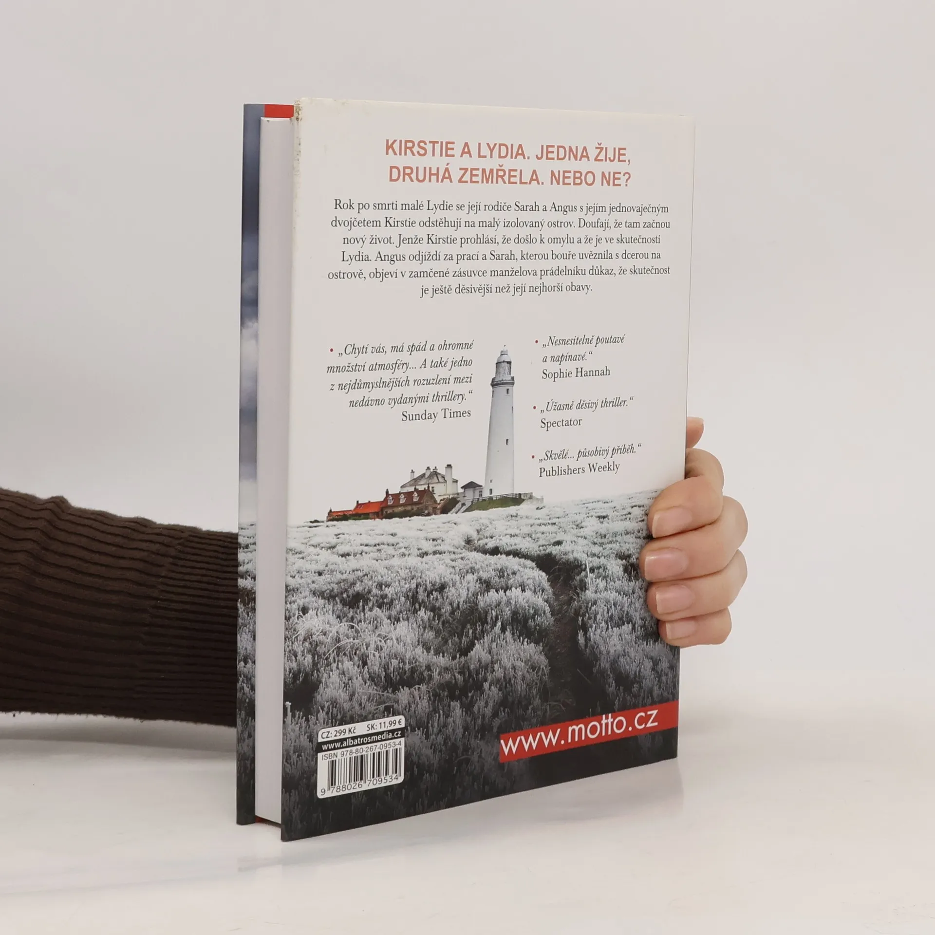Rok po tragické smrti malé Lydie se její rodiče Angus a Sarah Moorcroftovi s jejím jednovaječným dvojčetem Kirstie odstěhují na malý skotský ostrov, který Angus zdědil po své babičce. Doufají, že v novém prostředí se jim podaří složit dohromady střípky jejich starého života. Jenže pak jejich zbývající dcera Kirstie prohlásí, že právě ona je Lydie a Kirstie je dvojčetem, které zemřelo – a jejich svět se opět hroutí. S blížící se zimou je Angus nucen odcestovat z ostrova kvůli práci. Sarah trpí pocitem osamělosti a Kirstie (nebo je to Lydie?) je čím dál tím víc nevyrovnaná. Bouře zanechá Sarah s dcerou na ostrově zcela odříznuté a Sarah se začne znovu trápit minulostí – co se opravdu stalo toho osudného dne, kdy jedna z jejích dcer zemřela?