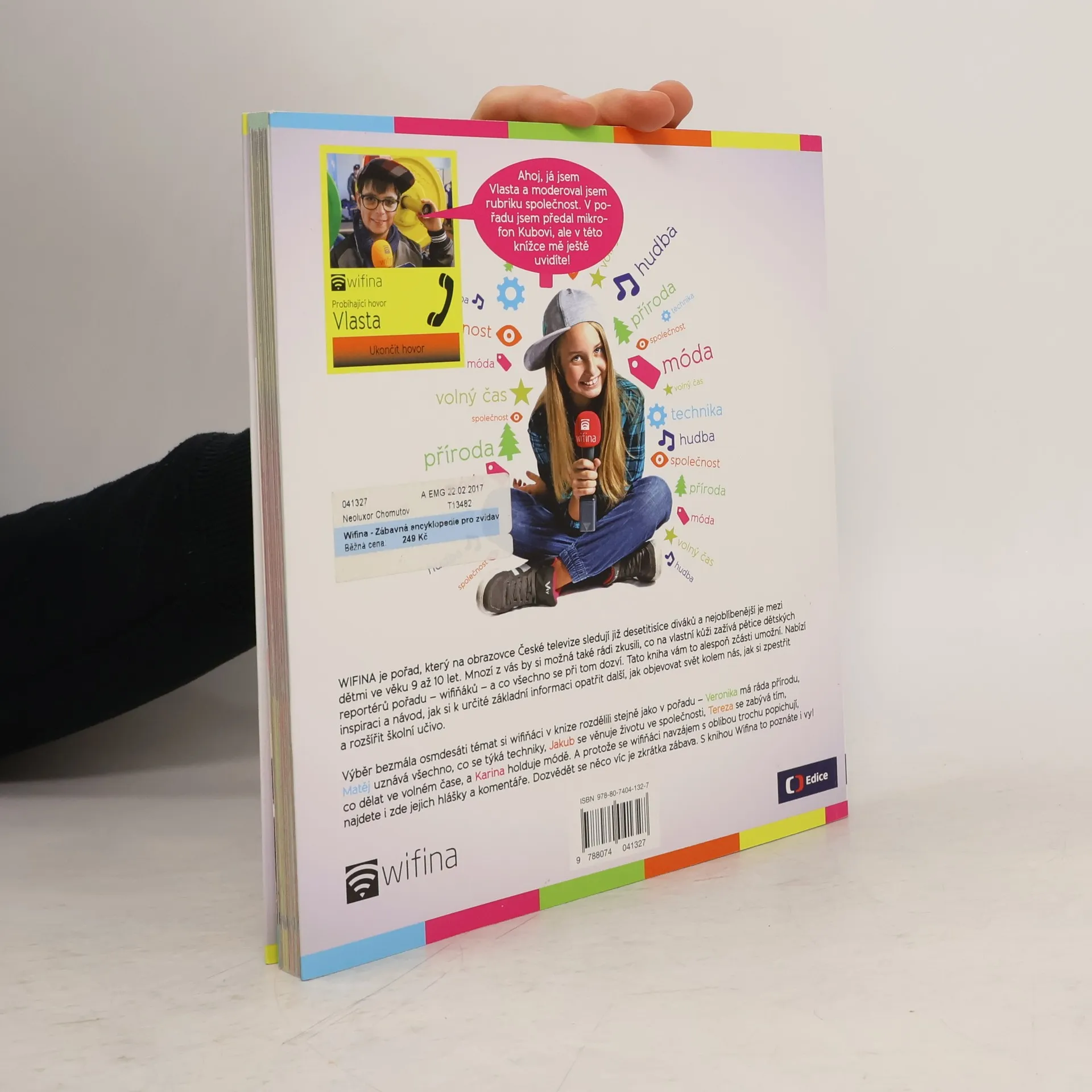 WIFINA je pořad, který se na obrazovce České televize objevil spolu se startem jejího dětského kanálu Déčko v září 2013. Dnes ho sledují již desetitisíce diváků a nejoblíbenější je mezi dětmi ve věku 9 až 10 let. Mnozí z nich by si také rádi zkusili, co na vlastní kůži zažívá pětice dětských reportérů – wifiňáků a co všechno se přitom dozví. KNIHA WIFINA jim to také umožní. Nabízí inspiraci a návod, jak si k určité základní informaci opatřit další, jak objevovat svět kolem nás, zpestřit si a rozšířit školní učivo. Výběr bezmála osmdesáti témat si wifiňáci v knize rozdělili stejně jako v pořadu – Veronika má ráda přírodu, Matěj uznává všechno, co se týká techniky, Jakub se věnuje životu ve společnosti, Tereza se zabývá tím, co dělat ve volném čase, a Karina holduje módě a hudbě. A protože se wifiňáci navzájem s oblibou trochu popichují, najdete i zde jejich „hlášky“ a komentáře. Dozvědět se něco víc je zkrátka zábava. S knihou Wifina to poznáte i vy!