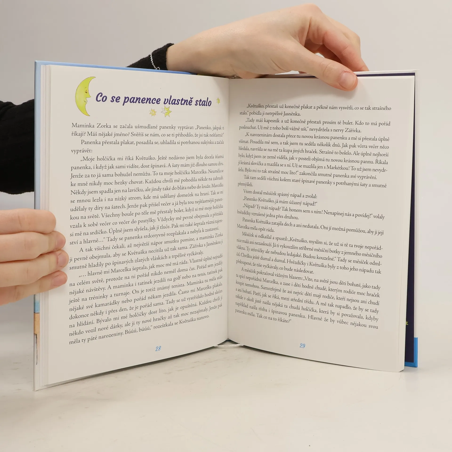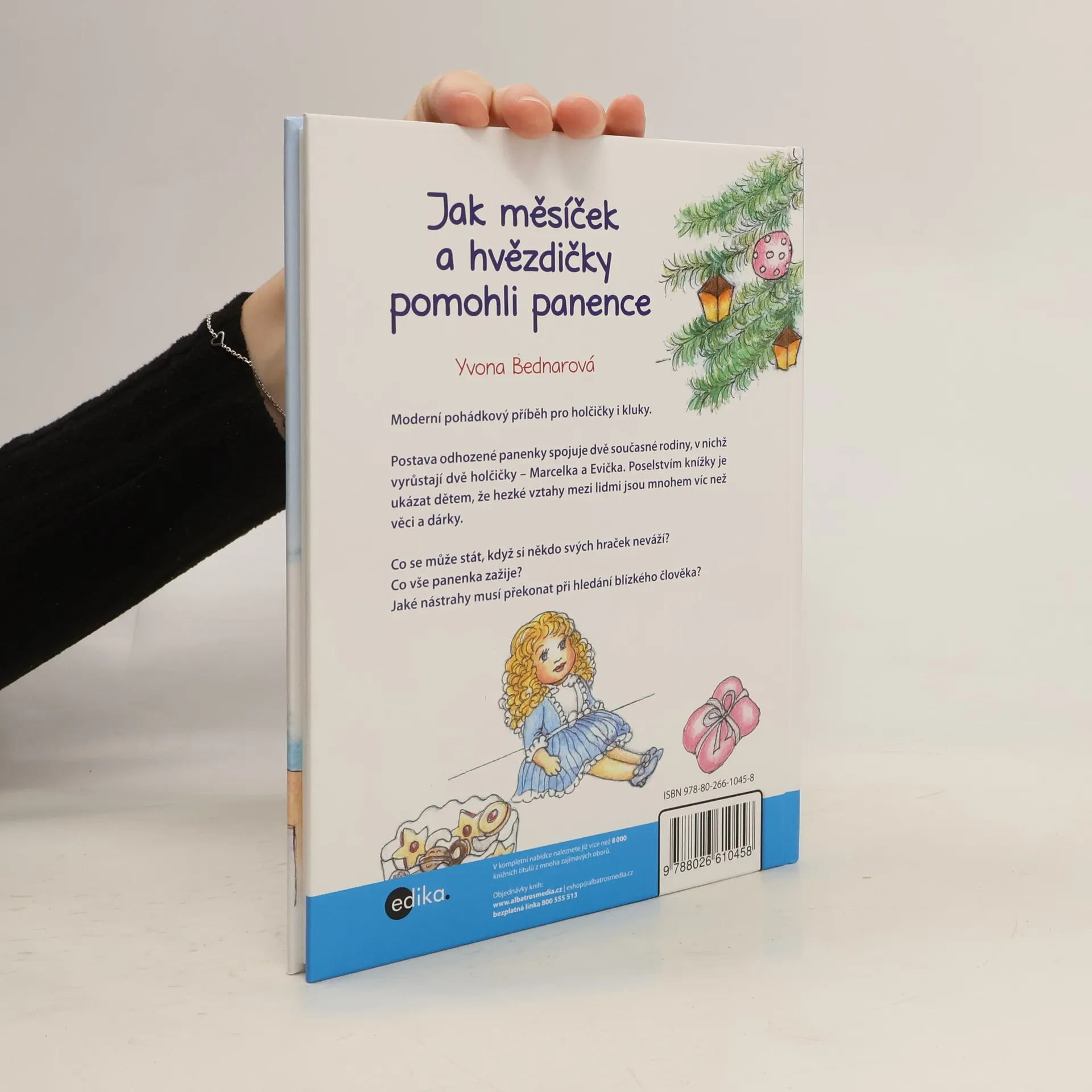 Kdo se ujme opuštěné panenky? Pohádkový příběh odhozené panenky dětem umožní nahlédnout do dvou současných rodin, ve kterých vyrůstají dvě holčičky - Marcelka a Evička. Obě mají milující rodiče, obě si rády hrají s hračkami, ale přesto je v každé rodině všechno jinak. Poselstvím knížky je ukázat dětem, že hezké vztahy mezi lidmi jsou mnohem cennější než drahé dárky a hromady krásného oblečení. Pohádkové postavy měsíčka a hvězdiček se snaží dát zašmodrchané vztahy do pořádku a pomoci překonávat překážky při hledání blízkého člověka.