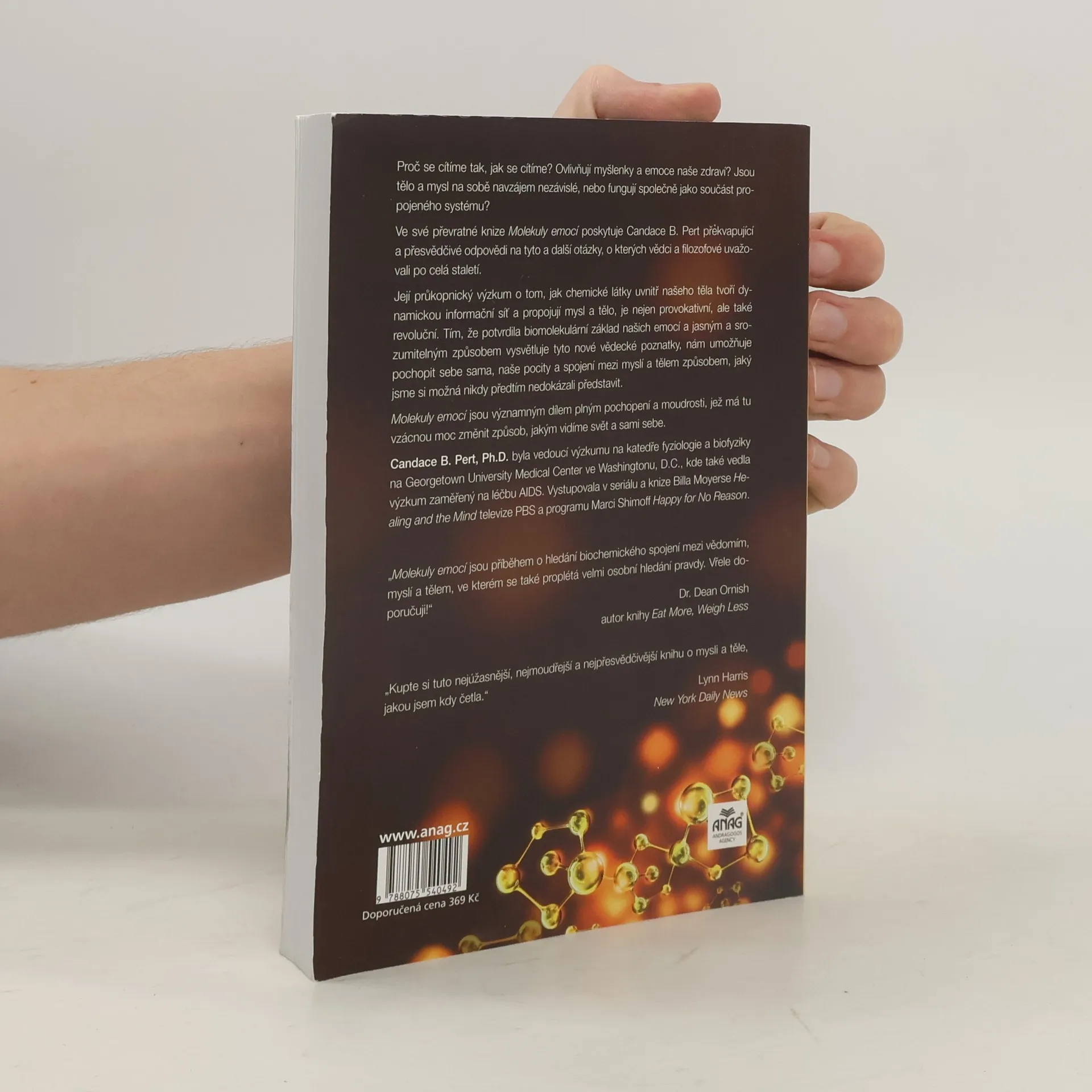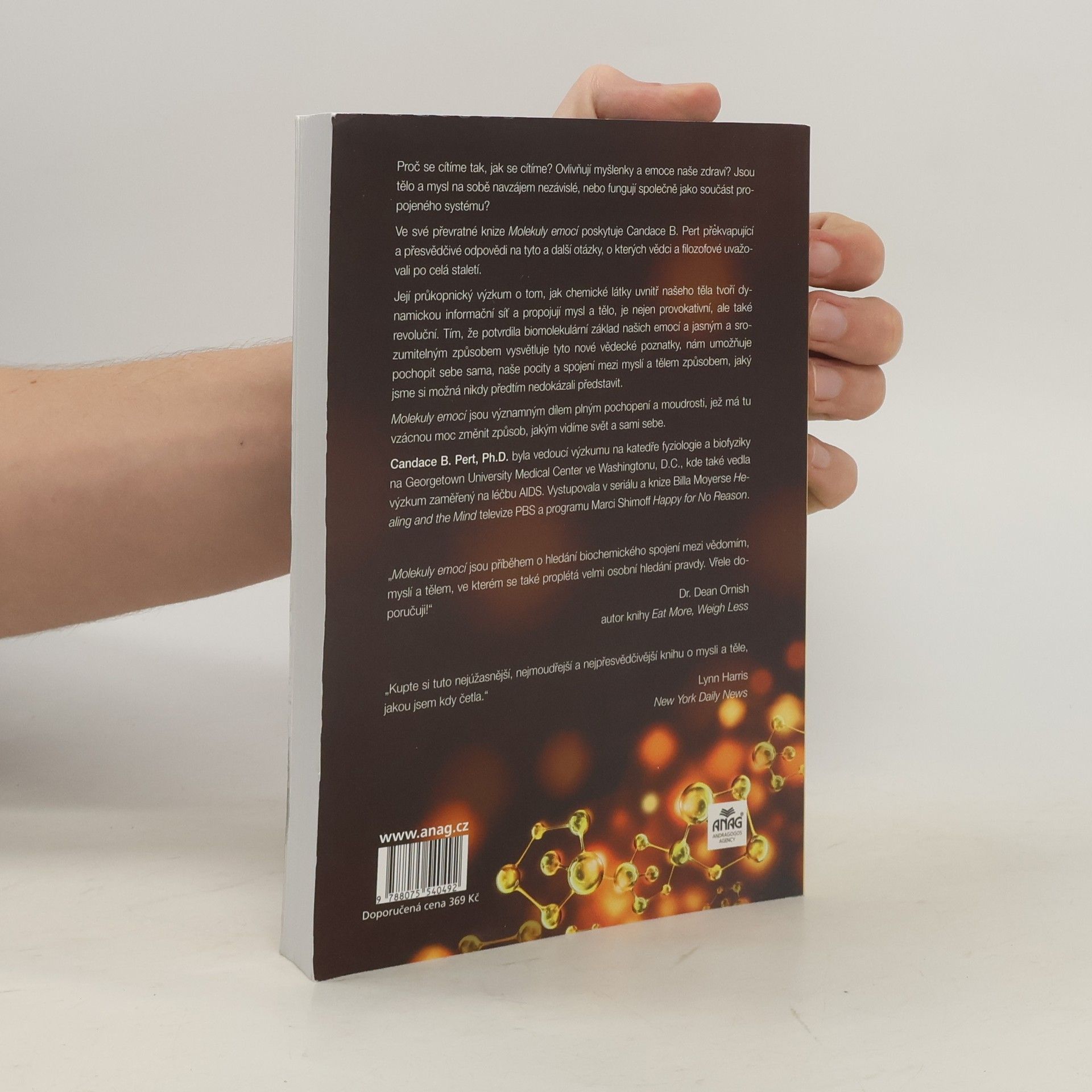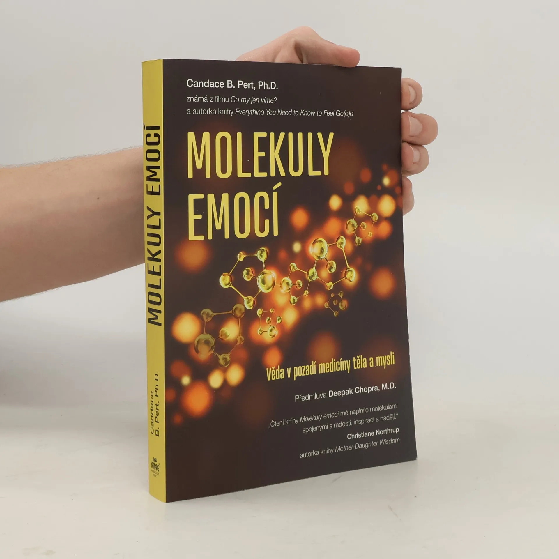 Proč se cítíme tak, jak se cítíme? Jak naše myšlenky a emoce ovlivňují naše zdraví? Jsou naše tělo a mysl od sebe navzájem odlišné, nebo fungují společně jako součást propojeného systému? Propojení těla a mysli. Ve své průkopnické knize Molekuly emocí Candace Pert poskytuje překvapivé a přesvědčivé odpovědi na tyto a další náročné otázky, o kterých vědci a filozofové uvažovali už po staletí. Její průkopnický výzkum o tom, jak chemikálie uvnitř našich těl tvoří dynamickou informační síť, propojující mysl a tělo, není pouze provokativní, nýbrž revoluční. Na základě stanovení biomolekulárního základu našich emocí a vysvětlení těchto nových vědeckých poznatků jasným a přístupným způsobem nám autorka umožňuje pochopit sama sebe, své pocity a spojení mezi naší myslí a naším tělem – těla-mysli – způsobem, který jsme si možná nikdy předtím nemohli představit. Molekuly emocí je dominantní dílo, plné pochopení a moudrosti a ovládnutí této vzácné síly ke změně způsobu, jakým vidíme svět a sami sebe.
