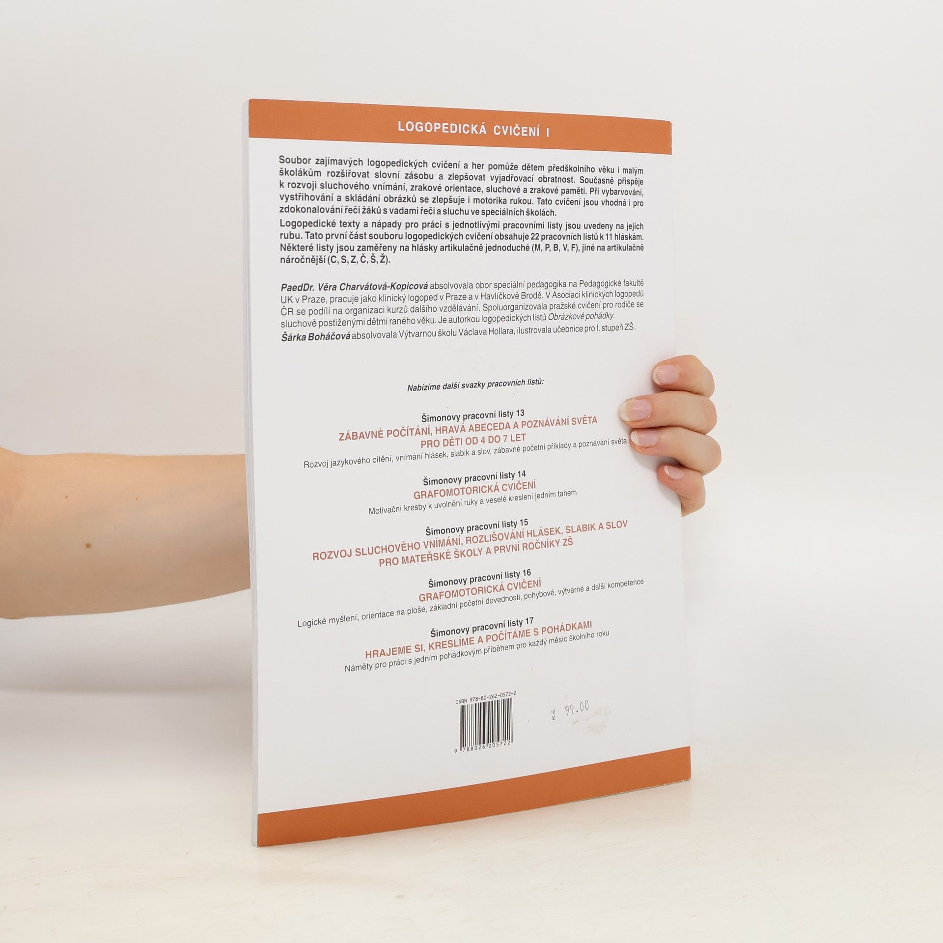 Logopedická cvičení I. Kniha obsahuje i předlohy pro kopírování. Logopedická cvičení - soubor první, obsahuje dvacetdva pracovních listů k jedenácti hláskám. Některé listy a cvičení jsou zaměřeny na hlásky artikulačně jednoduché (M, P, B, V, F), jiné na artikulačně náročnější (C, S, Z, Č, Š, Ž).