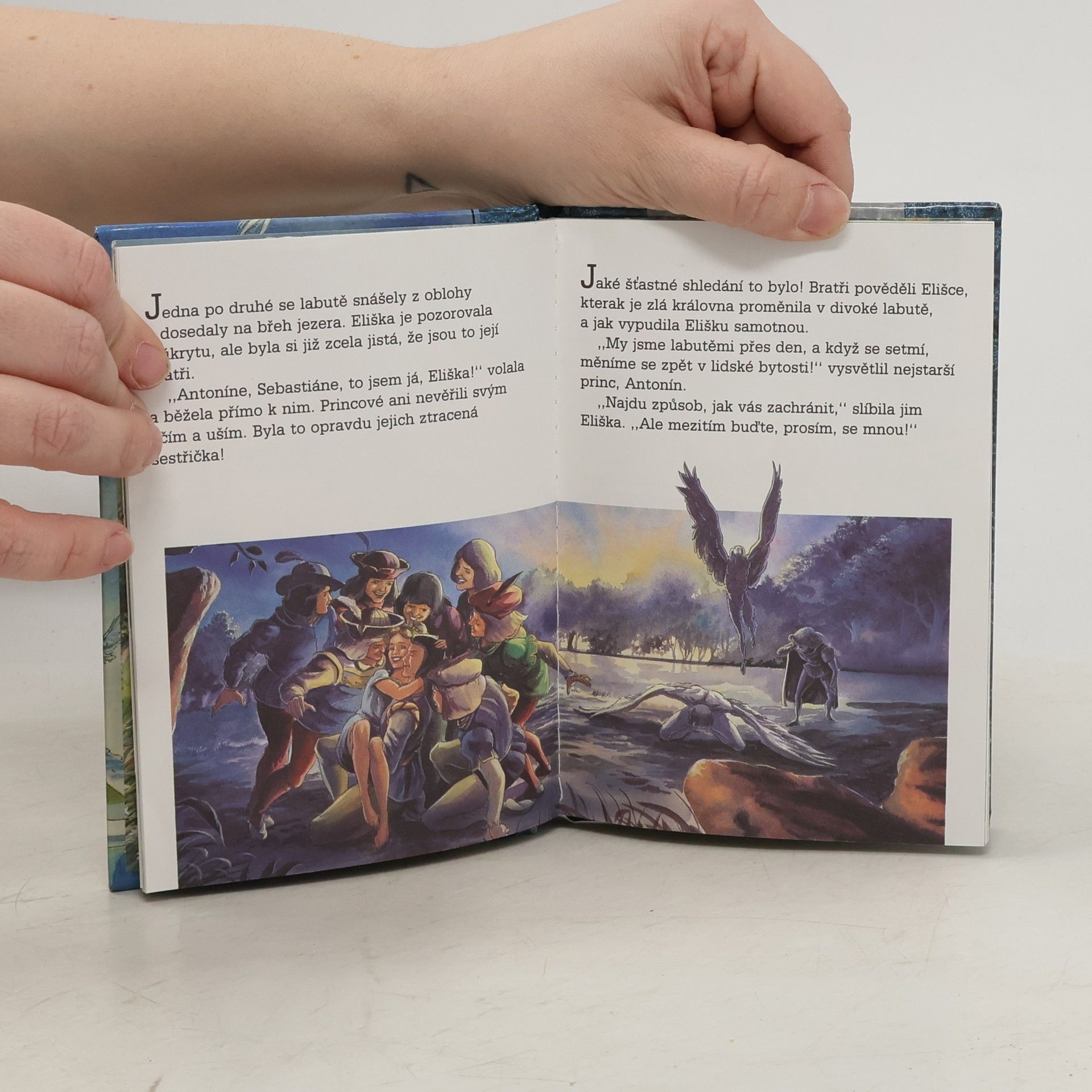 Daleko odtud, až kam odlétají vlaštovky, když je u nás zima, bydlel král a ten měl jedenáct synů a jednu dceru, Elišku. Těch jedenáct bratří chodilo do školy s hvězdou na prsou a šavlí po boku; psali na zlaté tabulky diamantovými kamínky, pěkně četli a učili se zpaměti. Sestra Eliška sedala na malé židličce z křišťálového skla a v ruce držela obrázkovou knihu, kterou jí koupili za půl království.