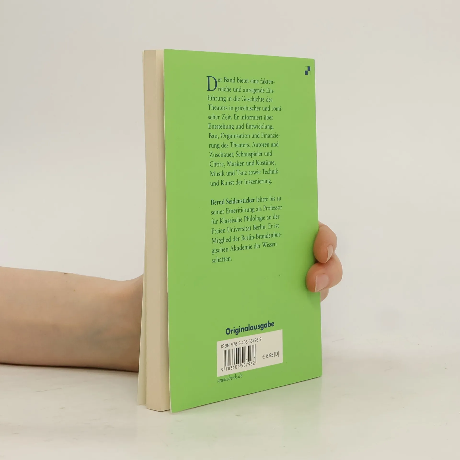 Bernd Seidensticker bietet eine anschauliche Einführung in die Geschichte des Theaters in griechischer und römischer Zeit. Er beschreibt seine Entstehung und Entwicklung, erläutert dramatische Formen, erklärt die Organisation des Theaters und seinen Aufbau, informiert über Schauspieler, Chöre und Musiker und beleuchtet Kunst und Technik der Inszenierung.