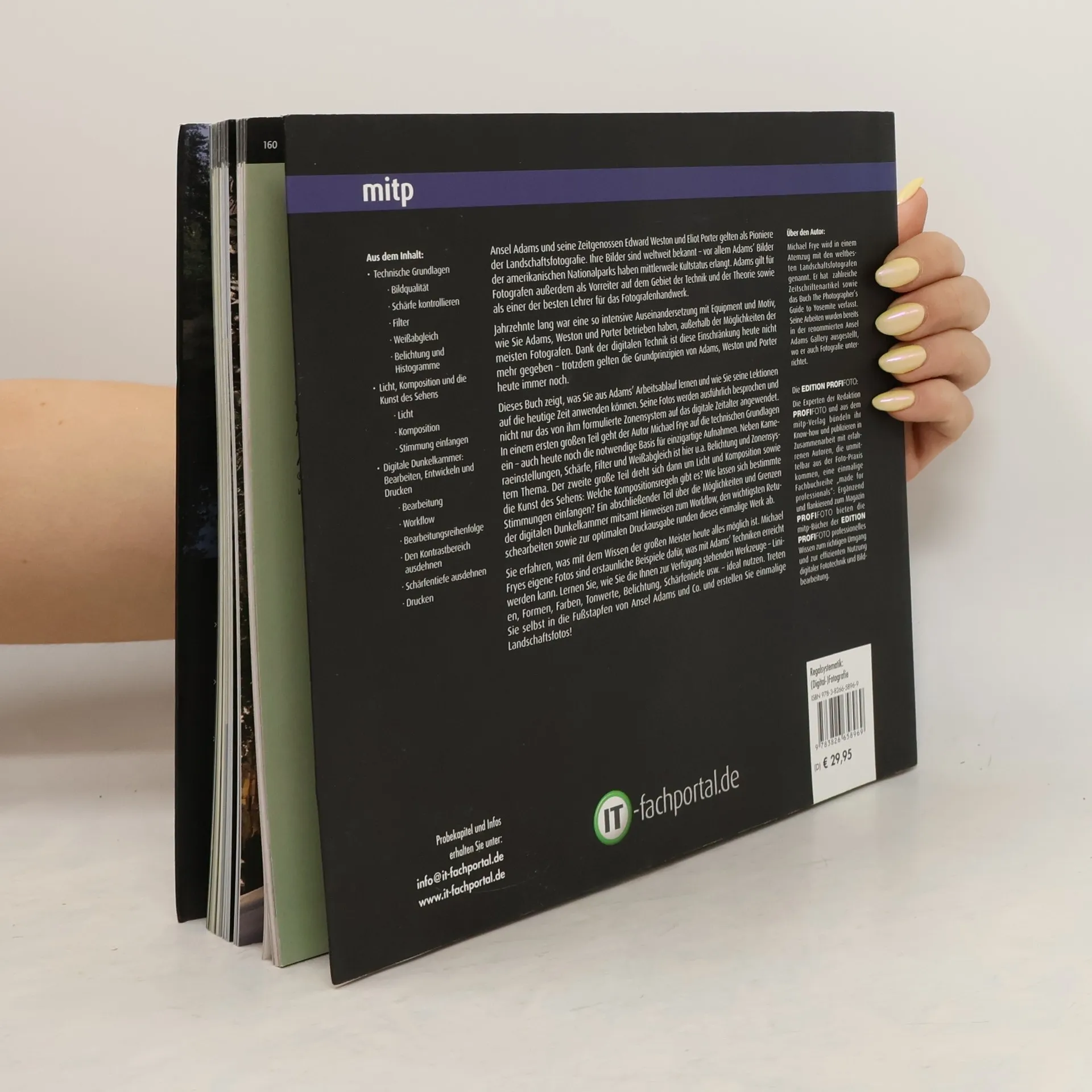 In diesem Buch zeigt Ihnen der Autor Michael Frye, wie Sie das Wissen, das schon Ansel Adams, Edward Weston und Eliot Porter hatten, auch im Zeitalter der digitalen Landschaftsfotografie anwenden können. Die technischen Grundlagen werden erläutert - auch heute noch Voraussetzung für einzigartige Landschaftsbilder. Das zweite große Thema des Buches ist Licht, Komposition und die sogenannte Kunst des Sehens. Abschließend geht der Autor auf die Möglichkeiten und Grenzen der digitalen Dunkelkammer ein. Der Autor belegt alles mit tollen Beispielbildern. Treten Sie selbst in die Fußstapfen von Ansel Adams und Co. und erstellen Sie einmalige Landschaftsfotos!