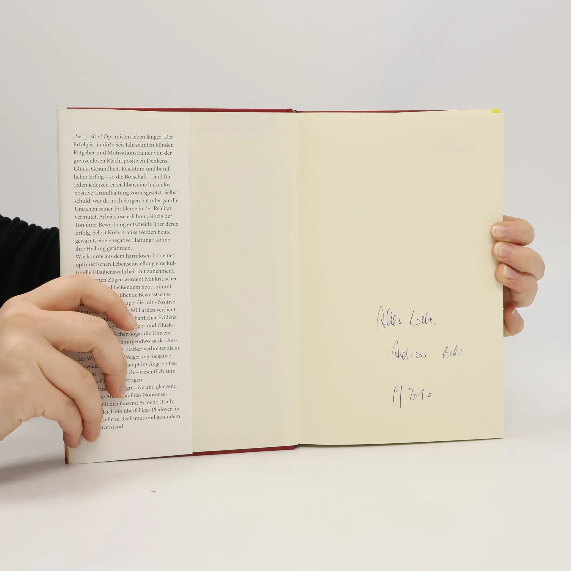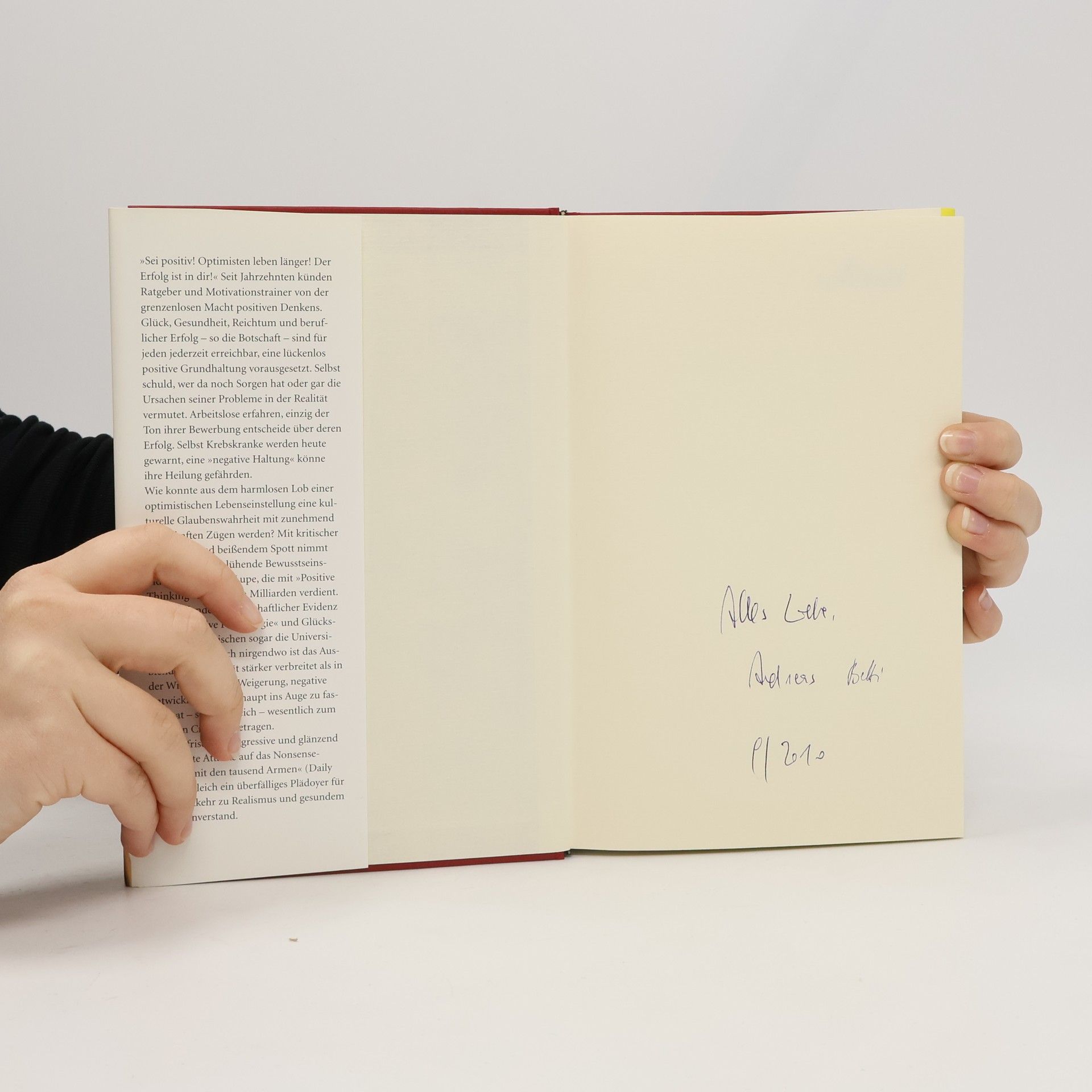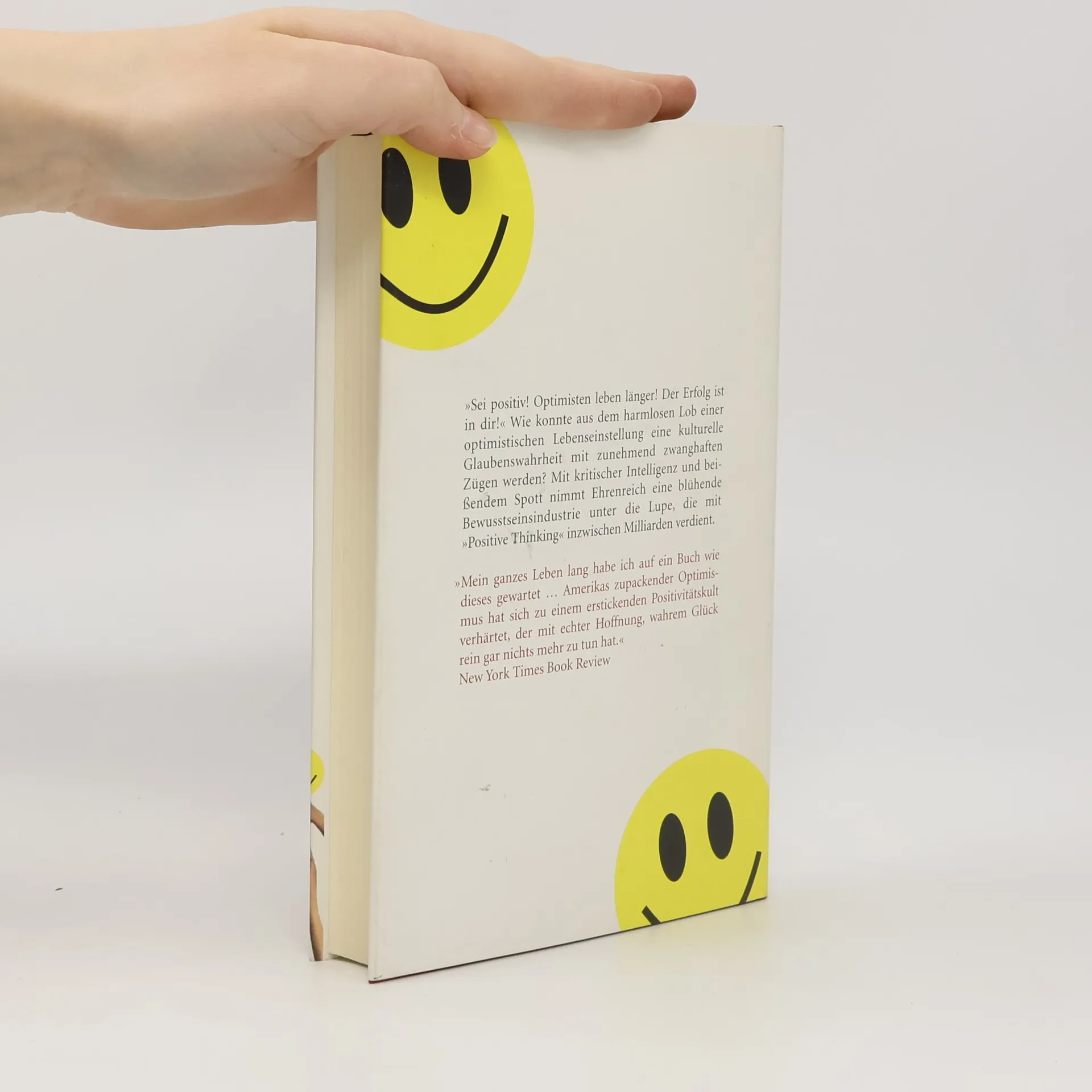 »Sei positiv! Optimisten leben länger! Der Erfolg ist in dir!« Diese Botschaften dominieren seit Jahrzehnten die Ratgeberliteratur und die Motivationstrainer. Glück, Gesundheit, Reichtum und beruflicher Erfolg sind demnach für jeden erreichbar, vorausgesetzt, man hat eine durchweg positive Grundhaltung. Wer Sorgen hat oder die Ursachen seiner Probleme in der Realität sucht, ist selbst schuld. Arbeitslosen wird gesagt, dass nur der Ton ihrer Bewerbung über deren Erfolg entscheidet, während Krebskranken eine »negative Haltung« als potenzielle Bedrohung für ihre Heilung angedichtet wird. Ehrenreich untersucht kritisch diese blühende Bewusstseinsindustrie, die mit »Positive Thinking« Milliarden verdient. Trotz fehlender wissenschaftlicher Beweise hat die »positive Psychologie« auch die Universitäten erobert. Besonders in der Wirtschaft wird die Realität oft ausgeblendet; diese Weigerung, negative Entwicklungen zu erkennen, hat laut Ehrenreich zum jüngsten Crash beigetragen. Ihre Analyse ist eine scharfsinnige und humorvolle Kritik an einem kulturellen Glaubenssystem, das dringend einen Rückkehr zu Realismus und gesundem Menschenverstand benötigt.