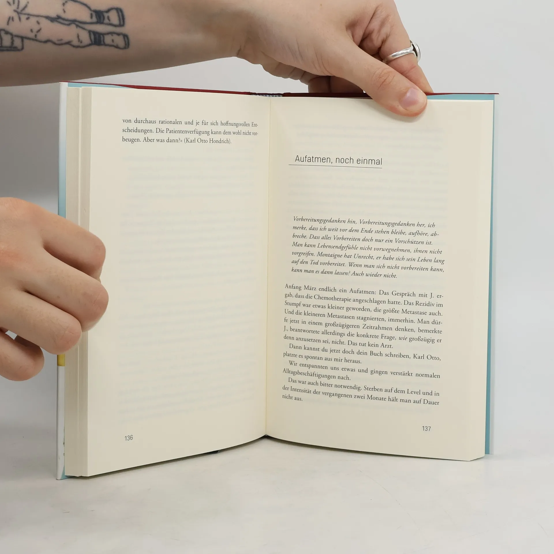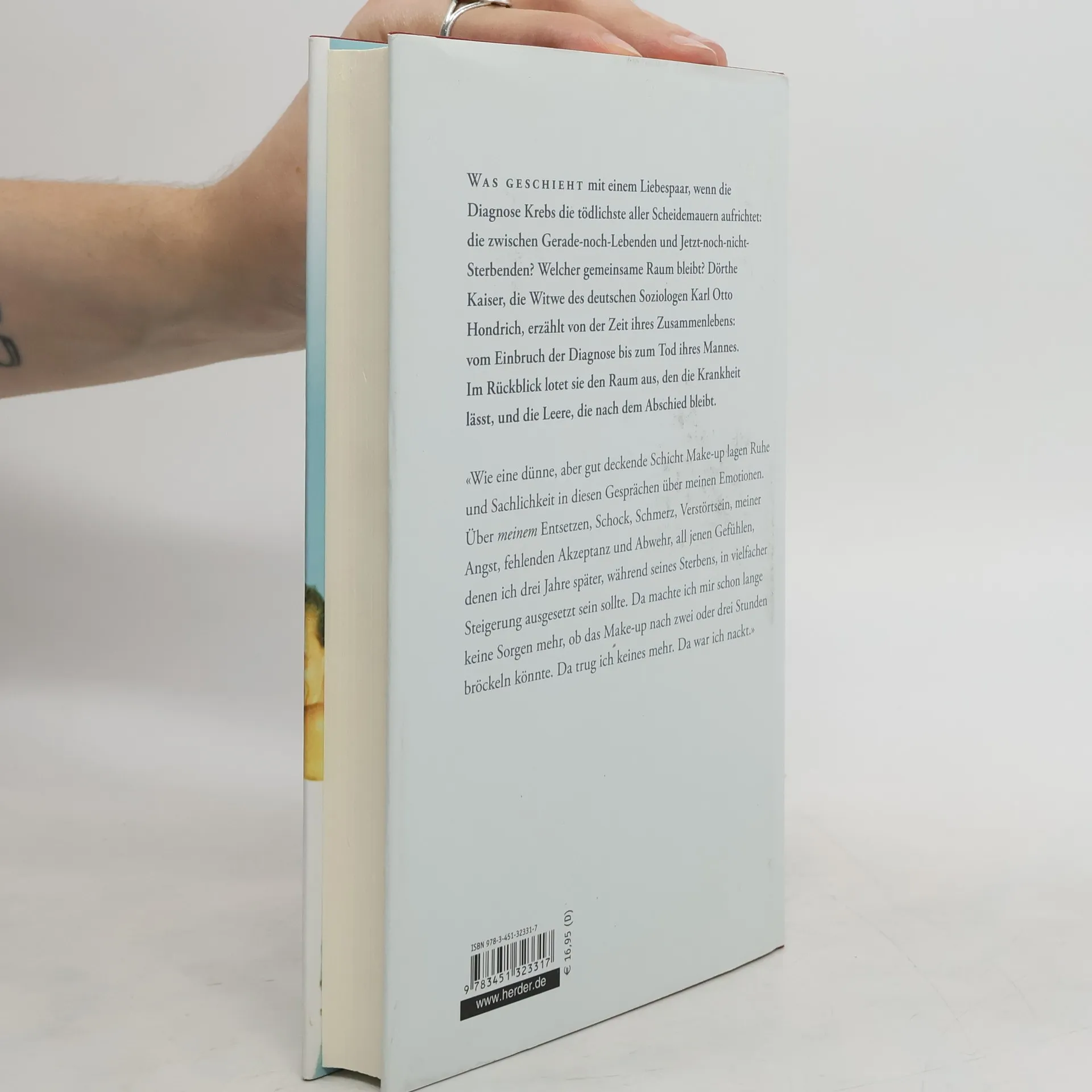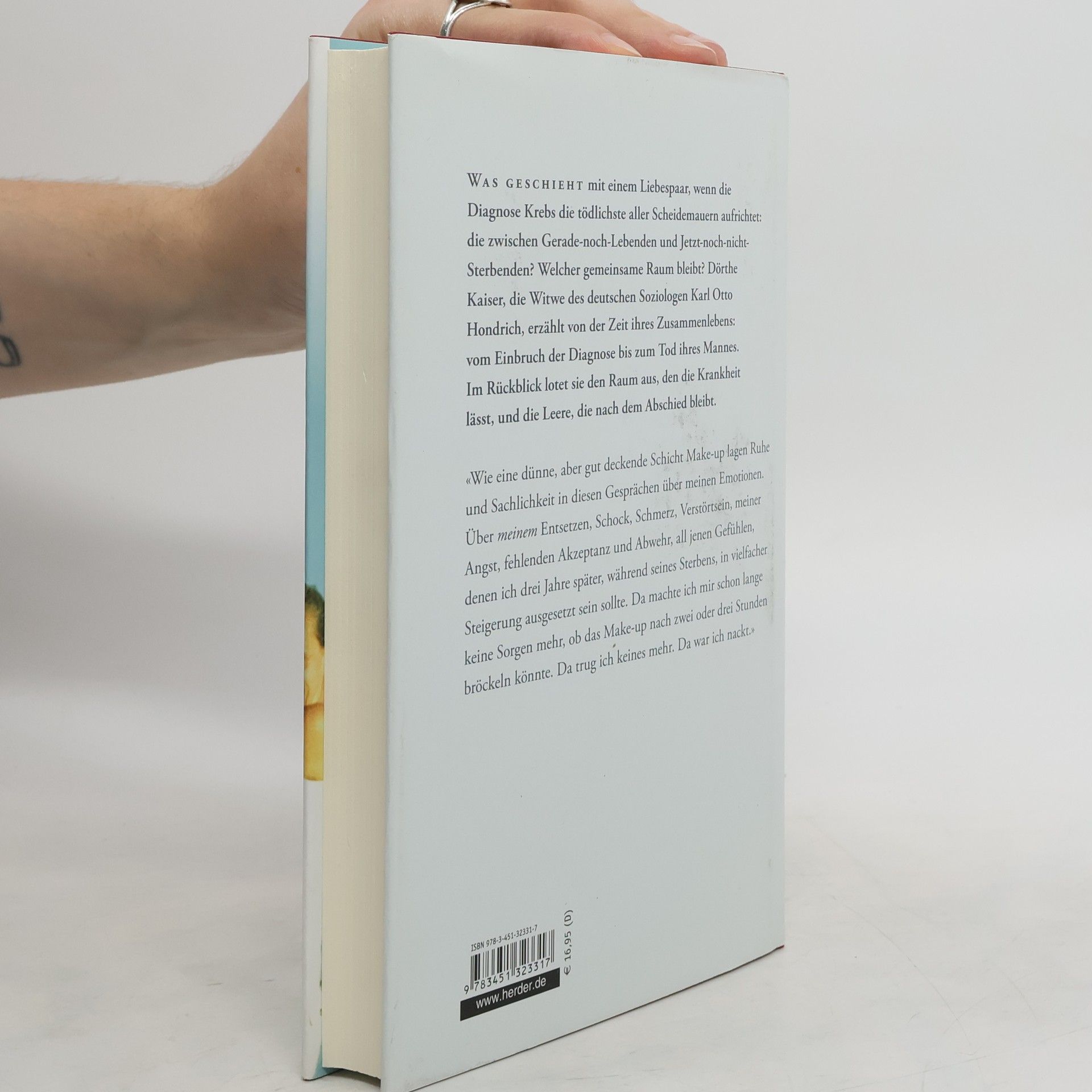 Was geschieht mit einem Liebespaar, wenn die Diagnose Krebs die tödlichste aller Scheidemauern aufrichtet: die zwischen Gerade-noch-Lebenden und Jetzt-noch-nicht-Sterbenden? Welcher gemeinsame Raum bleibt? Dörthe Kaiser, die Witwe des deutschen Soziologen Karl Otto Hondrich (1937-2007), erzählt von der Zeit ihres Zusammenlebens: vom Einbruch der Diagnose bis zum Tod ihres Mannes. Im Rückblick lotet sie den Raum aus, den die Krankheit lässt, und die Leere, die nach dem Abschied bleibt.