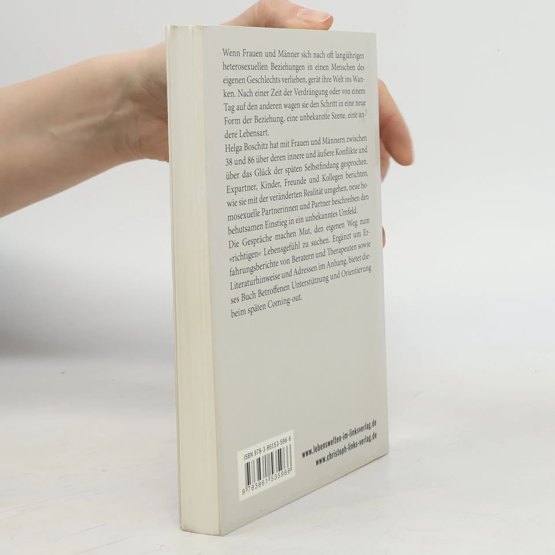 Wenn Frauen und Männer sich nach oft langjährigen heterosexuellen Beziehungen in einen Menschen des eigenen Geschlechts verlieben, gerät ihre Welt ins Wanken. Nach einer Zeit der Verdrängung oder von einem Tag auf den anderen wagen sie den Schritt in eine neue Form der Beziehung, eine unbekannte Szene, eine andere Lebensart. Helga Boschitz hat mit Frauen und Männern zwischen 38 und 86 über deren innere und äußere Konflikte und über das Glück der späten Selbstfindung gesprochen. Expartner, Kinder, Freunde und Kollegen berichten, wie sie mit der veränderten Realität umgehen, neue homosexuelle Partnerinnen und Partner beschreiben den behutsamen Einstieg in ein unbekanntes Umfeld. Die Gespräche machen Mut, den eigenen Weg zum 'richtigen' Lebensgefühl zu suchen. Ergänzt um Erfahrungsberichte von Beratern und Therapeuten sowie Literaturhinweise und Adressen im Anhang, bietet dieses Buch Betroffenen Unterstützung und Orientierung beim späten Coming-out.
