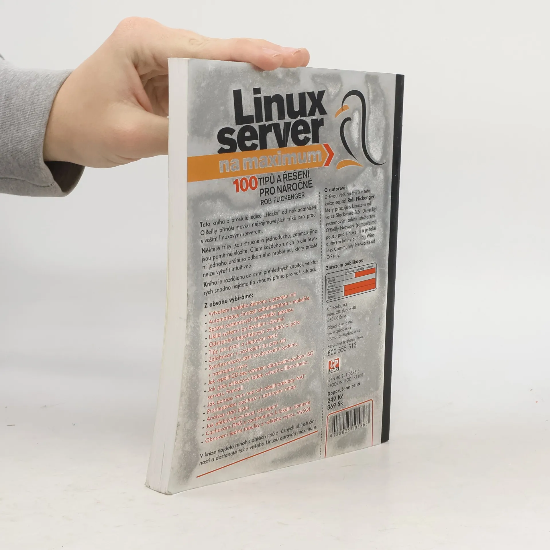Tato kniha z edice Hacks od O'Reilly přináší stovku triků pro práci s linuxovým serverem. Triky jsou různě složité, ale každý z nich řeší konkrétní odborný problém, který nelze snadno vyřešit. Kniha je rozdělena do osmi kapitol, což usnadňuje nalezení tipů pro vaši situaci. Kniha nabízí mnoho dalších tipů z různých oblastí a pomůže vám vytěžit maximum z vašeho Linuxu. Autorem většiny triků je Rob Flickenger, zkušený uživatel Linuxu a bývalý systémový administrátor O'Reilly Network.