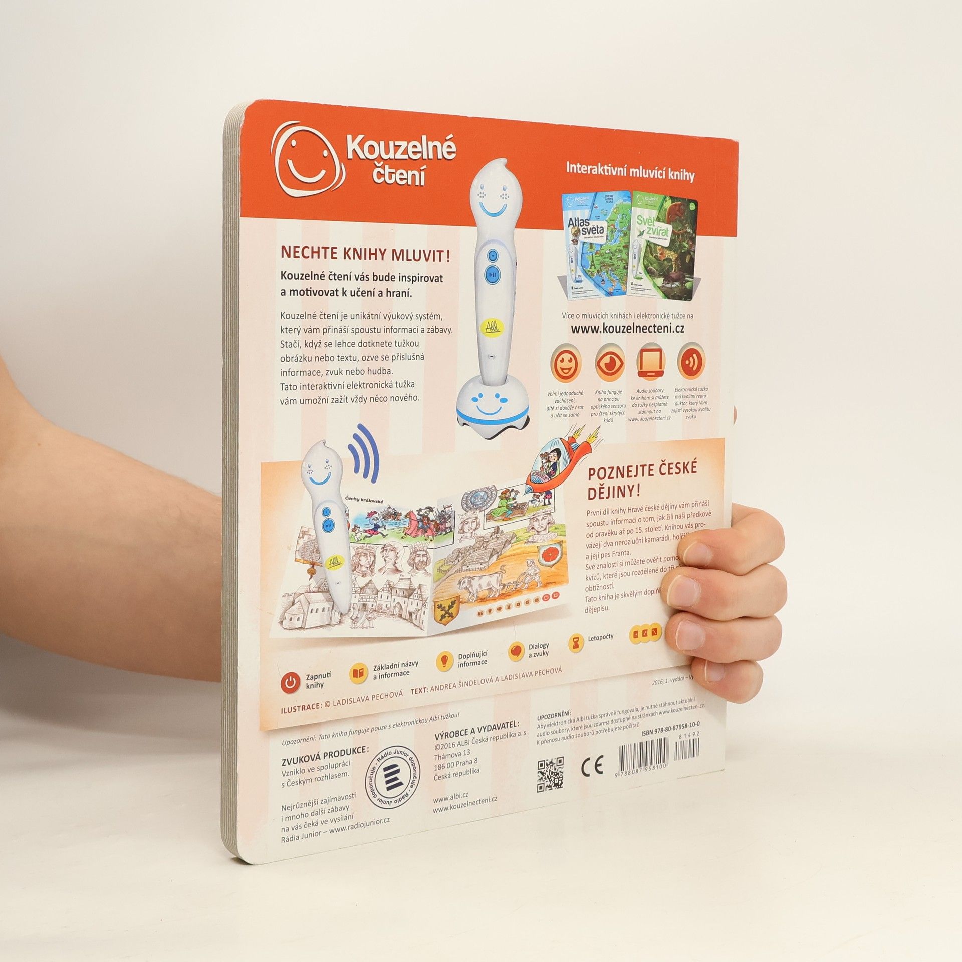 Interaktivní mluvící kniha Hravé české dějiny z edice Kouzelné čtení zabaví děti již od 6 let na dlouhou dobu. Knihu lze zároveň využít jako doplněk pro výuku dějepisu. První díl knihy Hravé české dějiny vám přináší spoustu informací o tom, jak žili naši předkové od pravěkuaž po 15. století. Knihou vás provází dva nerozluční kamarádi - holčička Anička a její pes Franta. V knize nechybí zábavné kvízy, které jsou rozděleny do 3 různých obtížností. Pomocí kvízů si můžete ověřit získané vědomosti. Kniha obsahuje přes 2300 zvuků a textů. Kniha vznikla ve spolupráci s Českým rozhlasem. Namluvili Otakar Brousek ml., Tereza Bebarová a Jana Holcová.
