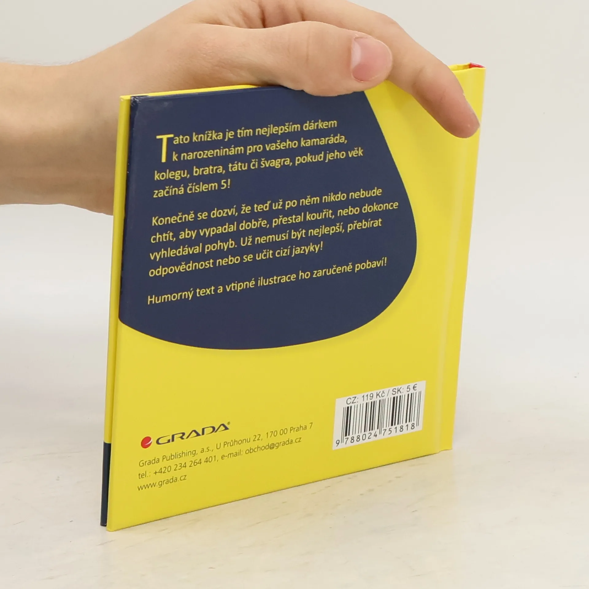 Tato knížka je tím nejlepším dárkem k narozeninám pro vašeho kamaráda, kolegu, bratra, tátu či švagra, pokud jeho věk začíná číslem 5! Konečně se dozví, že teď už po něm nikdo nebude chtít, aby vypadal dobře, přestal kouřit, nebo dokonce vyhledával pohyb. Už nemusí být nejlepší, přebírat odpovědnost nebo se učit cizí jazyky! Humorný text a vtipné ilustrace ho zaručeně pobaví a potěší!
