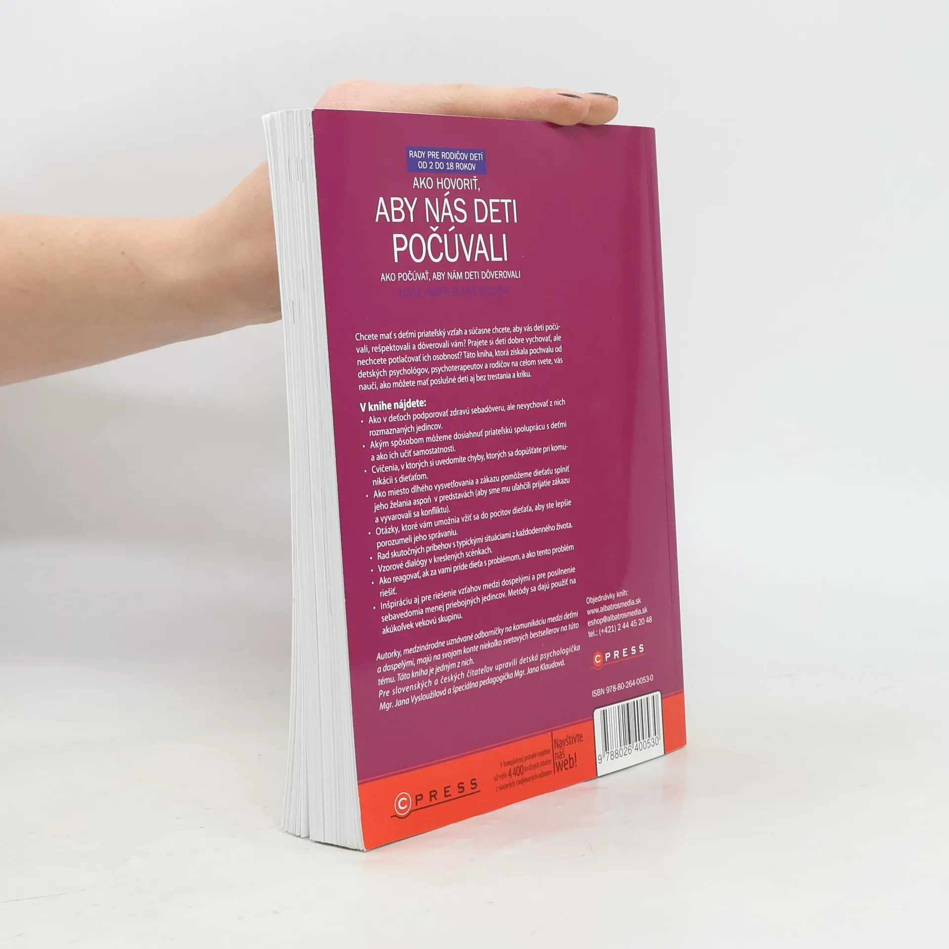 Adele Faber a Elaine Mazlish, uznávané psychologičky a odborníčky na komunikáciu, vás v tomto medzinárodnom bestselleri naučia krok za krokom techniky, ktoré vám pomôžu zlepšiť a obohatiť vzťahy s deťmi. V knihe sa nachádzajú nové postrehy a návrhy, ako aj časom preverené metódy k riešeniu spoločných problémov. Taktiež v nej môžeme nájsť inovatívne spôsoby ako sú napríklad: zapojiť ochotnú spoluprácu vášho dieťaťa určiť si pevné hranice a udržiavať dobrú vôľu používať alternatívy namiesto trestu, ktoré podporujú sebadisciplínu pochopiť rozdiel medzi ústretovou a nevhodnou pochvalou vyriešiť rodinné konflikty mierovou cestou pomôcť dieťaťu dosiahnuť pozitívne vnímania seba samého ako sa vyrovnať s negatívnymi pocitmi svojho dieťaťa, ako je frustrácia, hnev a sklamanie Kniha je číslo jedna medzi príručkami o vzťahu rodičov k deťom, pretože vzťahy s deťmi všetkých vekových kategórií robí menej stresujúce a viac obohacujúce a pomáha budovať základy pre trvalé vzťahy.