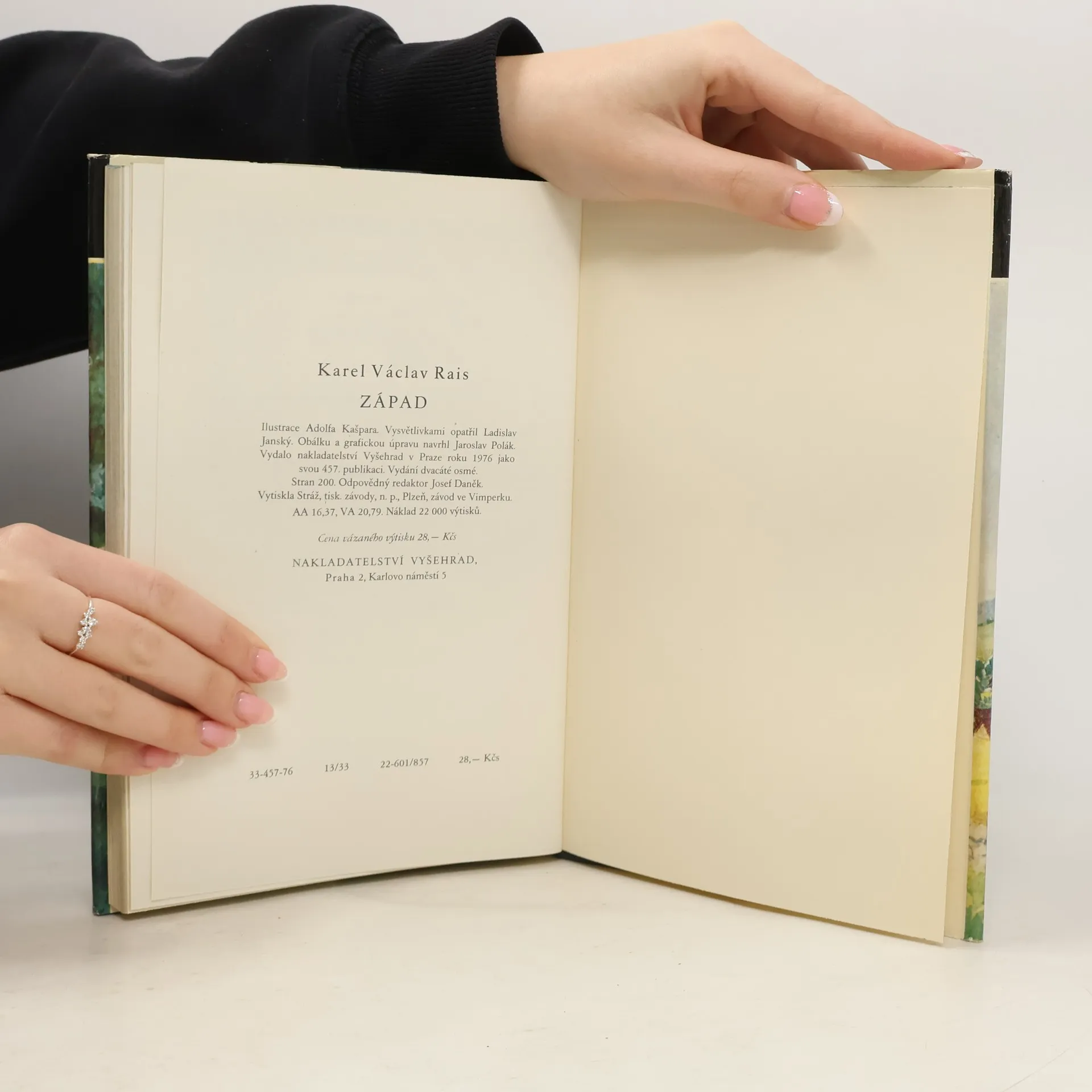 Román Západ (1899), stěžejní dílo velkého spisovatele, se dosud ocital ve stínu autorových románů „líbivějších“ (Zapadlí vlastenci) a „čtivějších“ (Kalibův zločin). Autor mnoha populárních povídek a románů, řazený v učebnicových přehledech mezi realistické zpodobitele venkova, zde v komorním příběhu starého faráře zachycuje nejen atmosféru zapadlého koutu Vysočiny, ale i psychologické drama stáří, zodpovědnosti k obci a vlastní práci pro ni. Dosavadní vydání Raisova románu doprovázely tradiční, románu poněkud odlehlé ilustrace Kašparovy. Současné vydání, připravené edičně Robertem Adamem a opatřené komentářem prof. Jaroslavy Janáčkové, vyjde poprvé s ilustracemi Raisova osobního přítele Antonína Slavíčka. Ilustrace z fondů roudnické Galerie moderního umění, reprodukované na zvláštním křídovém papíře, zpřítomňují drsný a přece poetický kraj Hlinecka.