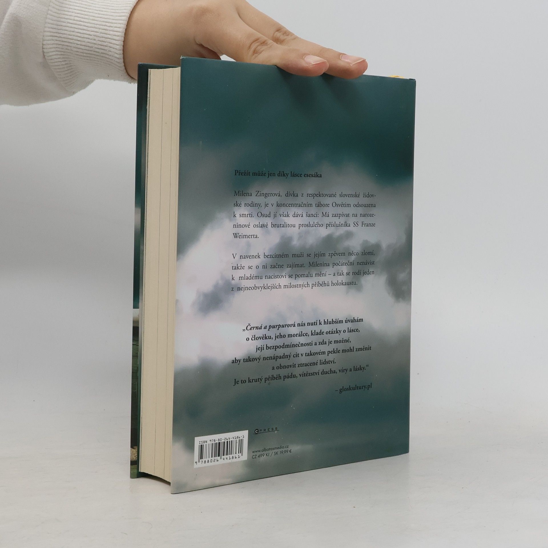 Příběh lásky mezi slovenskou židovkou a nacistou z Osvětimi inspirovaný skutečnými událostmi Milena Zingerová, dívka z respektované slovenské židovské rodiny, je v koncentračním táboře Osvětim odsouzena k smrti. Osud jí však dává šanci: Má zazpívat na narozeninové oslavě brutalitou proslulého příslušníka SS Franze Weimerta. V navenek bezcitném muži se jejím zpěvem něco zlomí, takže se o ni začne zajímat. Milenina počáteční nenávist k mladému nacistovi se pomalu mění – a tak se rodí jeden z nejneobvyklejších milostných příběhů holokaustu. Mladý Němec vytáhl z pouzdra Parabellu, nabil a bezmyšlenkovitě lékaře střelil do hlavy. Pressburger padl mrtvý k zemi. Dívka ucítila zápach krve. Tehdy pohlédla na Němce, doktorova vraha. Byl velmi mladý. Nemohl mít víc než dvacet let, možná dvacet dva. Pomyslela si, že je to její vrstevník. Schoval pistoli do pouzdra. I mladý Němec na ni pohlédl. Jejich pohledy se nad mrtvolou lékaře setkaly. Milena vycítila, že má před sebou naprosto lhostejného a bezohledného muže, který by ji zabil stejně chladnokrevně jako starého Pressburgera. „Černá a purpurová vypráví příběh velmi složitého vztahu mezi dvěma mladými lidmi, ale především ukazuje komplikovaný vztah mezi katem a obětí.“ – gloskultury.pl