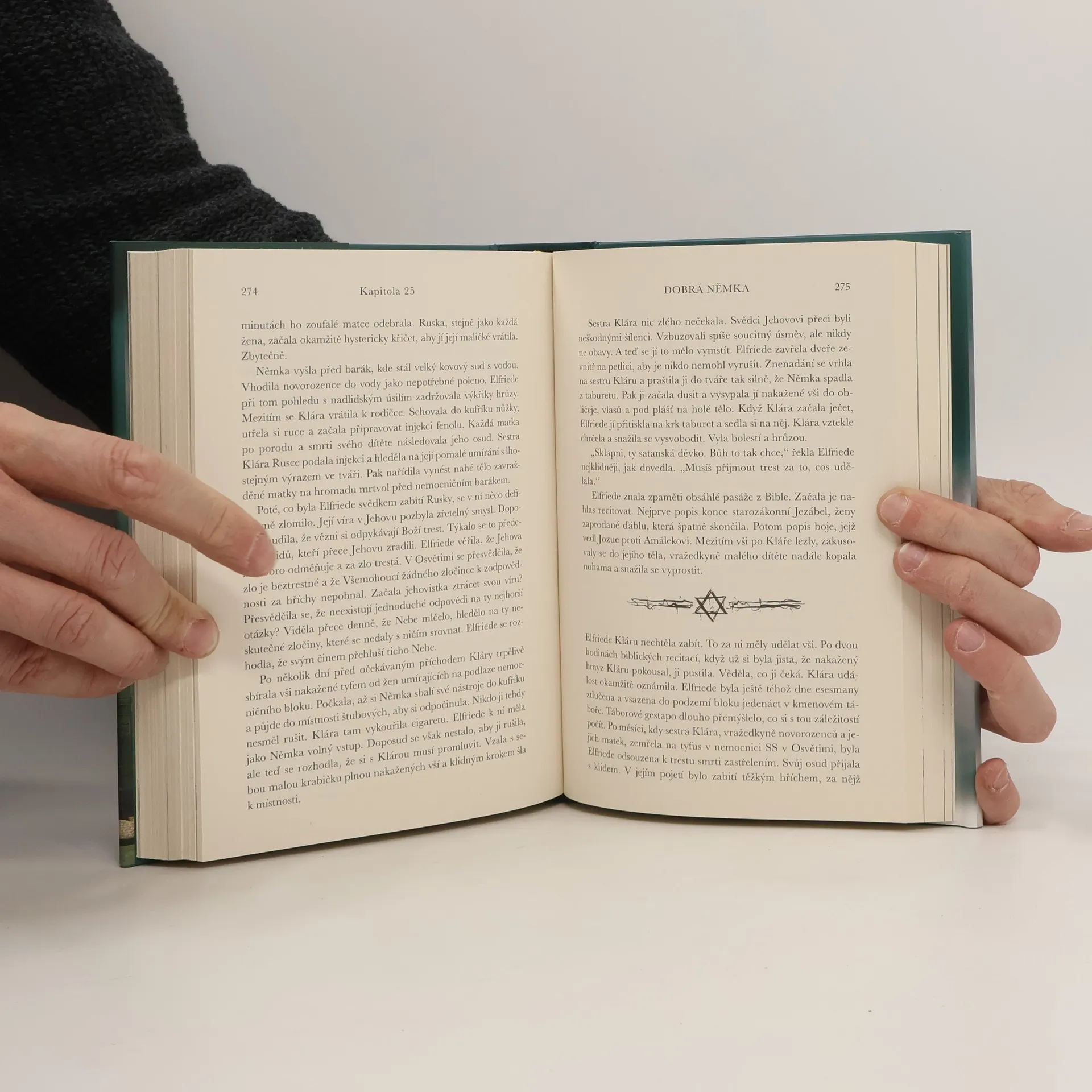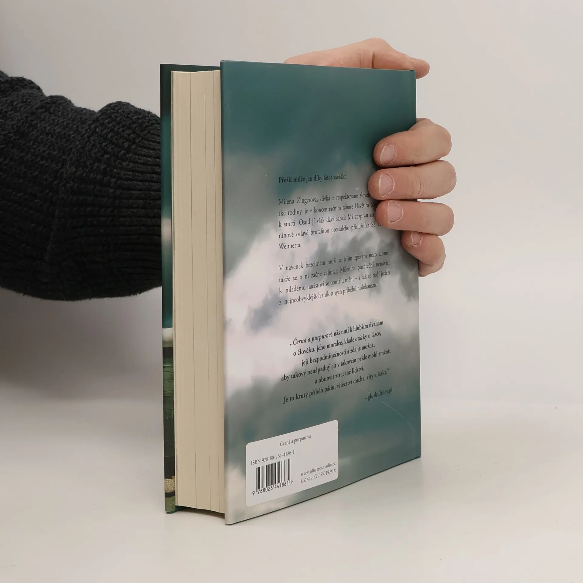 Příběh lásky mezi slovenskou židovkou a nacistou z Osvětimi inspirovaný skutečnými událostmi Milena Zingerová, dívka z respektované slovenské židovské rodiny, je v koncentračním táboře Osvětim odsouzena k smrti. Osud jí však dává šanci: Má zazpívat na narozeninové oslavě brutalitou proslulého příslušníka SS Franze Weimerta. V navenek bezcitném muži se jejím zpěvem něco zlomí, takže se o ni začne zajímat. Milenina počáteční nenávist k mladému nacistovi se pomalu mění – a tak se rodí jeden z nejneobvyklejších milostných příběhů holokaustu. Mladý Němec vytáhl z pouzdra Parabellu, nabil a bezmyšlenkovitě lékaře střelil do hlavy. Pressburger padl mrtvý k zemi. Dívka ucítila zápach krve. Tehdy pohlédla na Němce, doktorova vraha. Byl velmi mladý. Nemohl mít víc než dvacet let, možná dvacet dva. Pomyslela si, že je to její vrstevník. Schoval pistoli do pouzdra. I mladý Němec na ni pohlédl. Jejich pohledy se nad mrtvolou lékaře setkaly. Milena vycítila, že má před sebou naprosto lhostejného a bezohledného muže, který by ji zabil stejně chladnokrevně jako starého Pressburgera. „Černá a purpurová vypráví příběh velmi složitého vztahu mezi dvěma mladými lidmi, ale především ukazuje komplikovaný vztah mezi katem a obětí.“ – gloskultury.pl