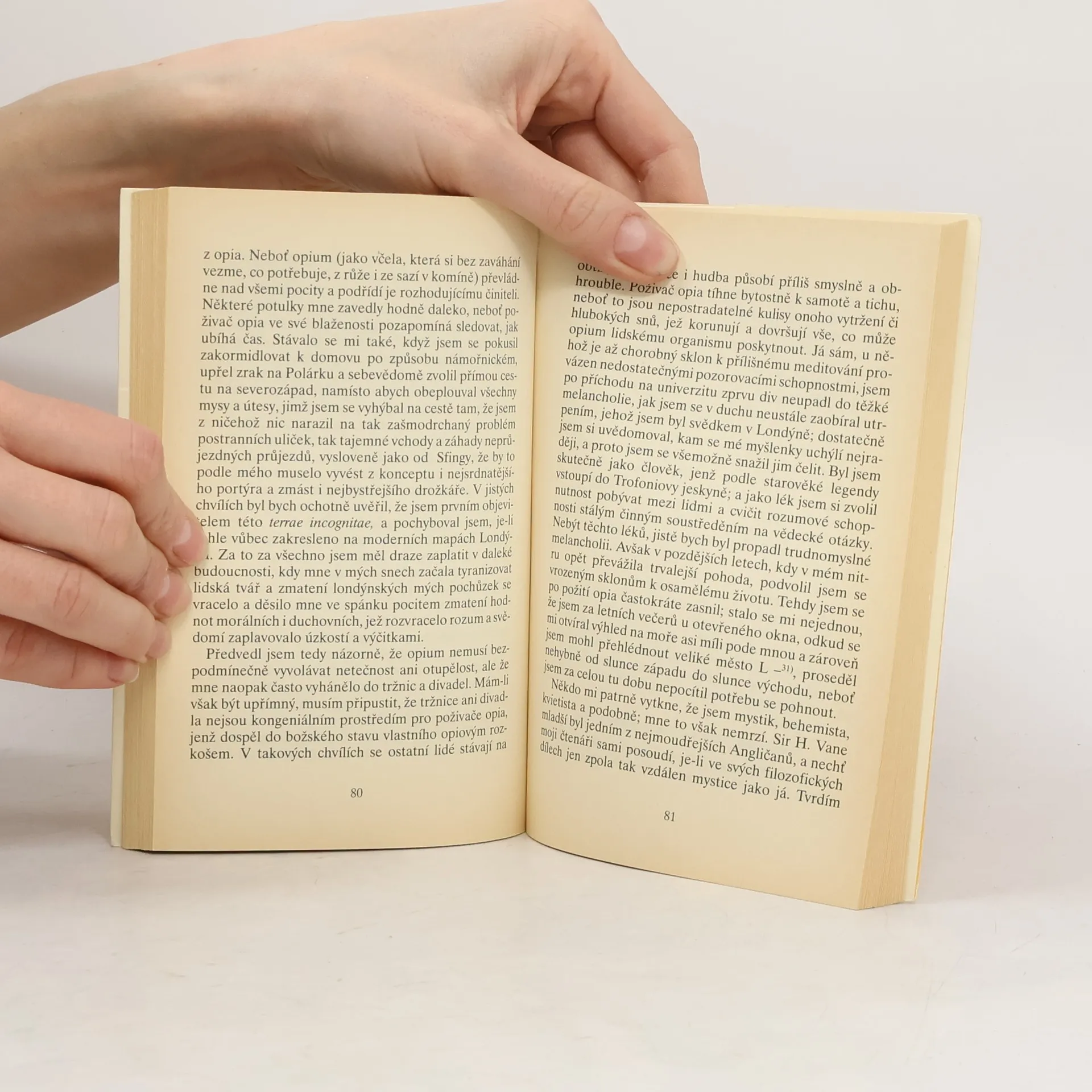 Opiová zpověď T. De Quinceyho se po mnoha stránkách vymyká běžné memoárové literatuře, na jakou byli angličtí čtenáři z počátku devatenáctého století zvyklí. Opium mu otevřelo „bránu rajských rozkoší“, svět úchvatných vizí, snů a fantastických smyslových vjemů, jen aby ho vzápětí uvrhlo do propastného utrpení fyzického i duševního. Jde o pozoruhodné vylíčení psychedelické zkušenosti, a to půldruhého století před „klasiky“ 60. let. Vyd. v tomto překladu 1.